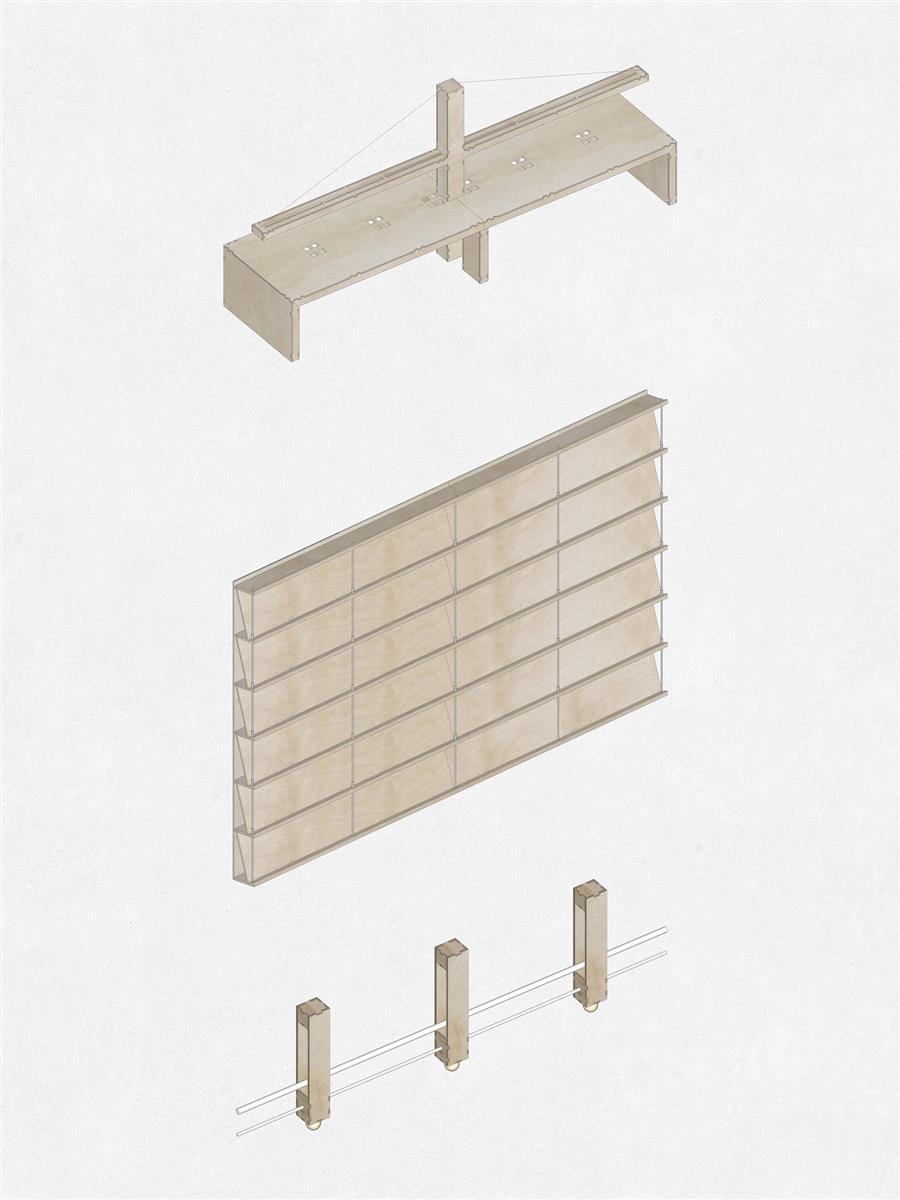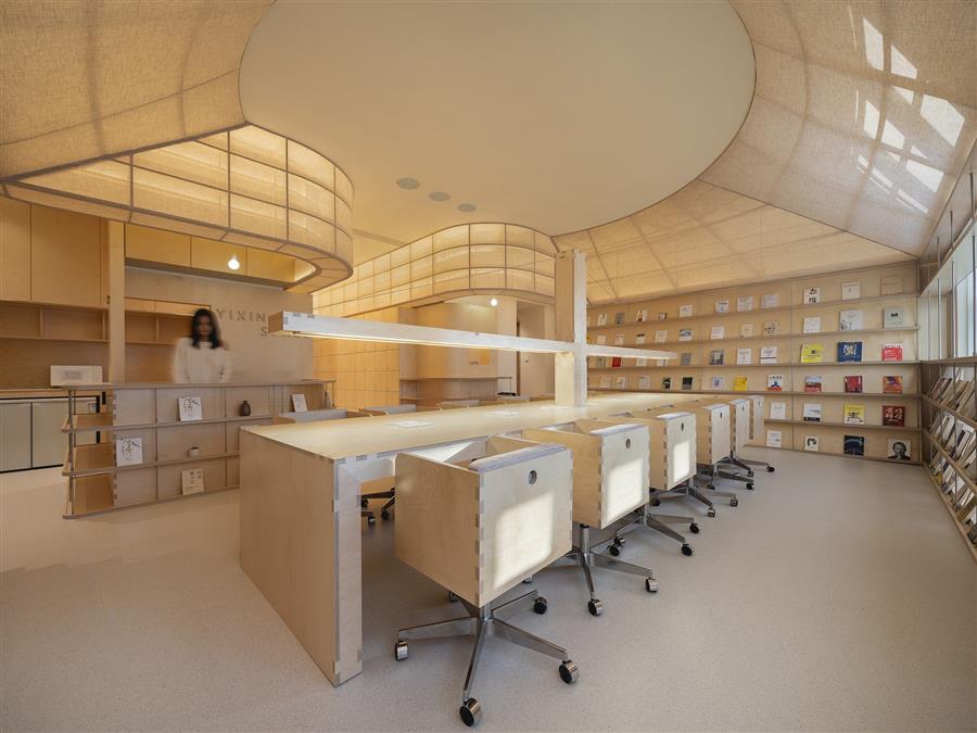 一盞懸浮的燈籠意向裝置仿佛空間的精神圖騰,安靜的盤旋在空中。樺木多層板經(jīng)數(shù)字化設(shè)計,構(gòu)建出精細(xì)的榫卯細(xì)部,其木質(zhì)骨骼隱于布料之后,若隱若現(xiàn),當(dāng)光線穿透時有了呼吸的節(jié)奏。白天,日光溫柔地穿過布料與木骨架的間隙,在書桌上投射出層次豐富的光影,靈動而詩意。夜晚,溫暖的燈光透過半透紗幔,在頂部暈染出一片柔和的微光,仿佛漂浮的夢境。這個懸浮的發(fā)光裝置不僅是功能性的照明系統(tǒng),更是空間的精神象征,其投影隨著太陽角度在12小時內(nèi)完成從實(shí)到虛的形態(tài)漸變。