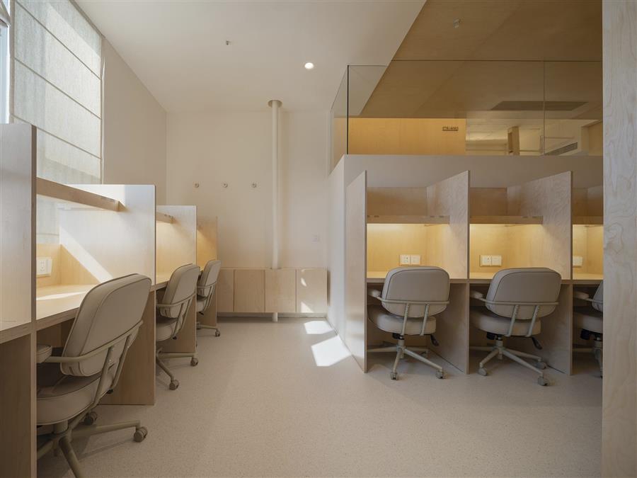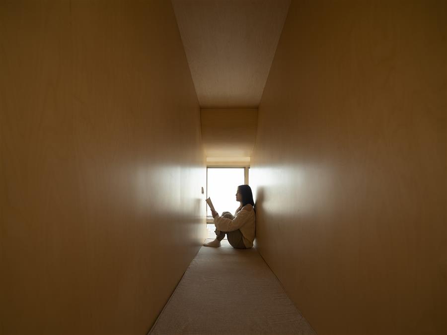 在豎向設(shè)計上,我們設(shè)計了具有趣味性的攀爬路徑,選擇空間里頂部障礙物較少的區(qū)域置入疊加功能區(qū),在自習(xí)區(qū)里穿插了多個立體盒子,增大了使用面積的同時,也增添了有趣的空間體驗(yàn)。沿著爬梯向上,便抵達(dá)精神性空間 —— 冥想小屋。這個艙體空間兼具躺臥與靜坐功能,盡端的透明消隱式桌子,讓使用者在百米高空俯瞰城市脈絡(luò),在此體驗(yàn)一覽眾山小的意境。