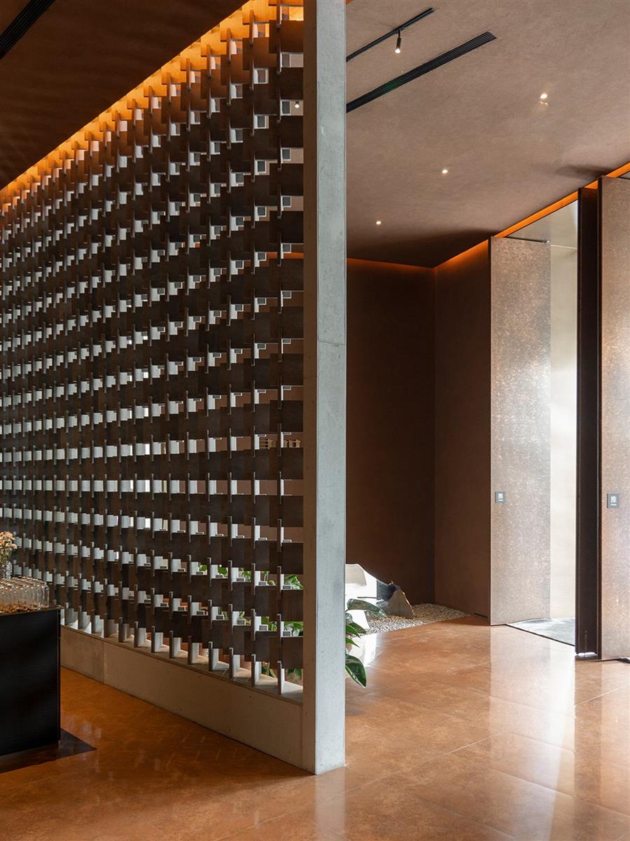 通高的入口門扇營造出具有張力的抵達(dá)體驗。緊接內(nèi)部的鏤空水泥板榫卯拼接屏風(fēng),配合張華老師為內(nèi)向空間所創(chuàng)作的雕塑作品,藝術(shù)氣氛逐漸蔓延開來。