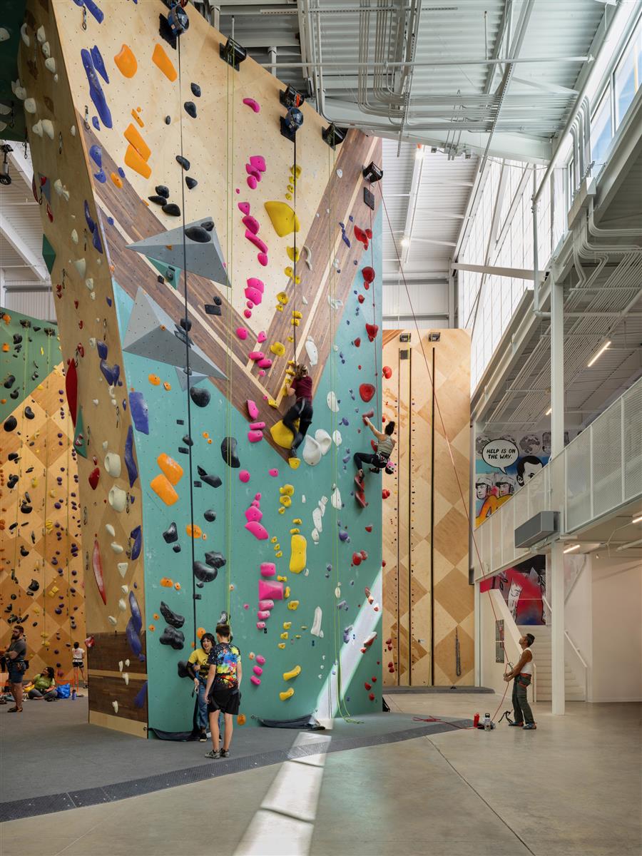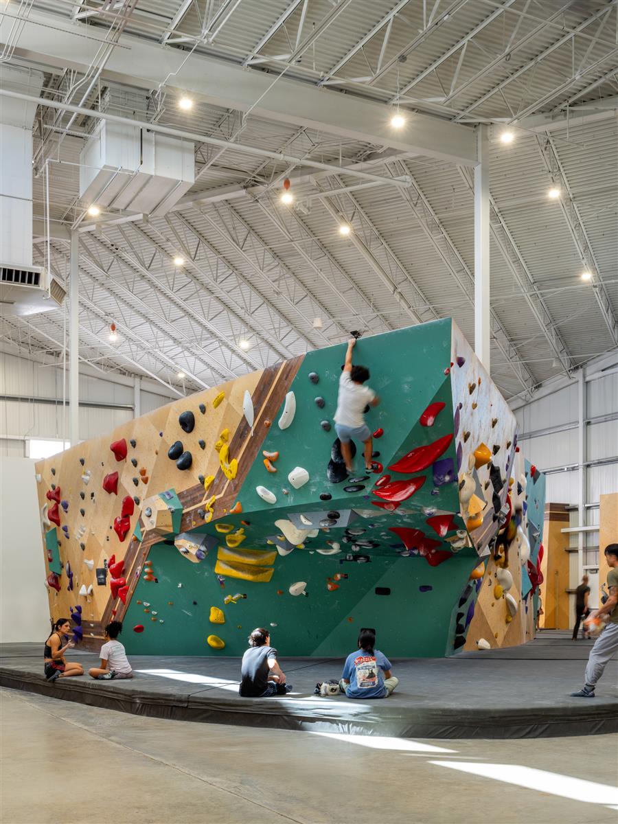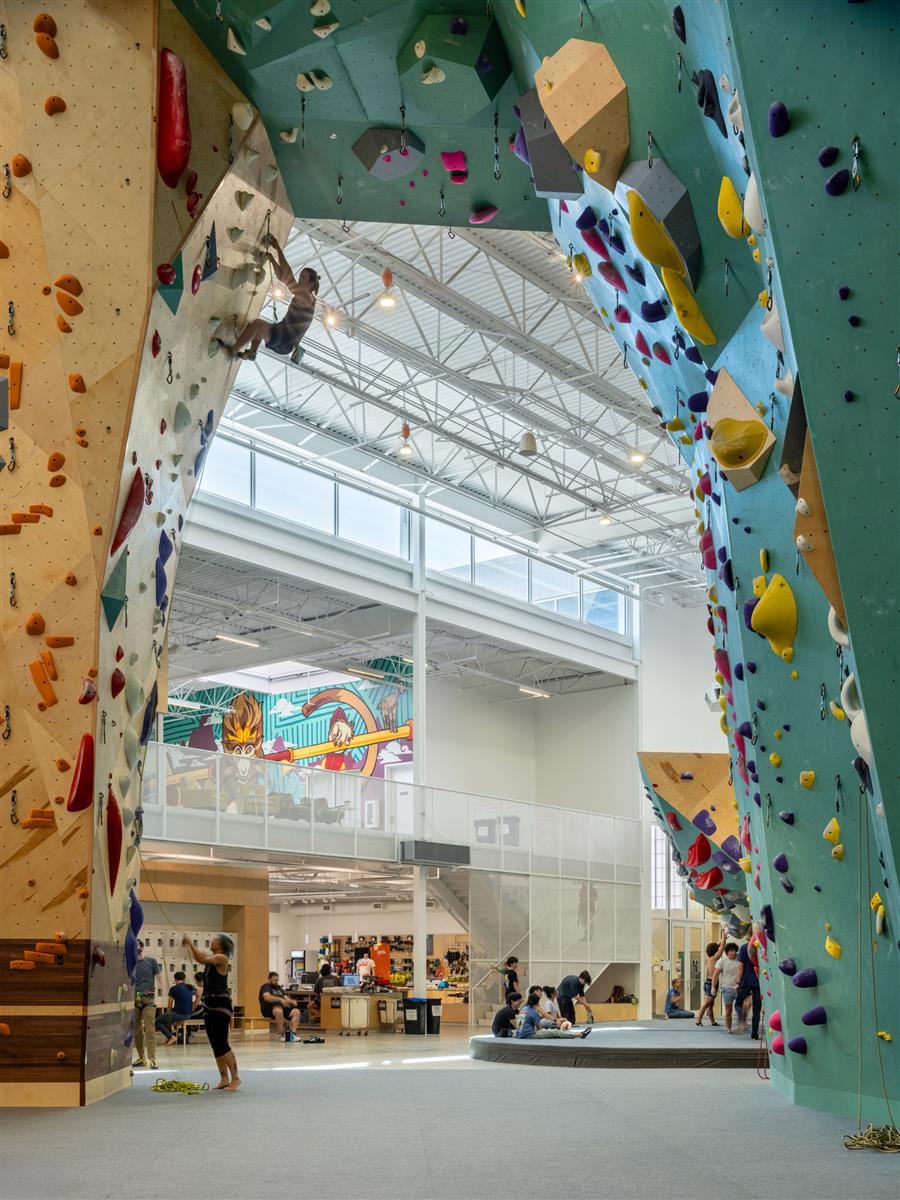 該設(shè)施擁有全面的配套設(shè)施,包括抱石區(qū)、符合國際標(biāo)準(zhǔn)的55英尺比賽攀巖墻、專門的兒童攀巖區(qū)、瑜伽和健身工作室、自由舉重區(qū)、零售空間和歡迎休息室。一個中央景觀庭院,由一個誘人的現(xiàn)場咖啡店固定,引入了郊區(qū)環(huán)境中不常見的行人友好的戶外空間,促進(jìn)社區(qū)互動,為游客提供一個充滿活力的社交環(huán)境。