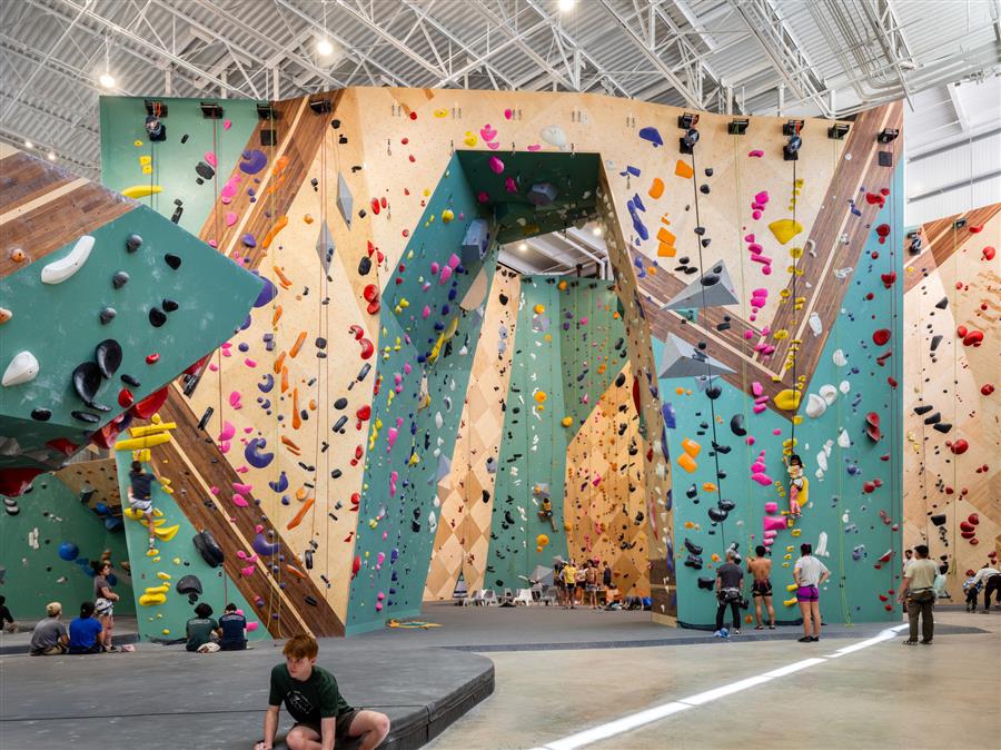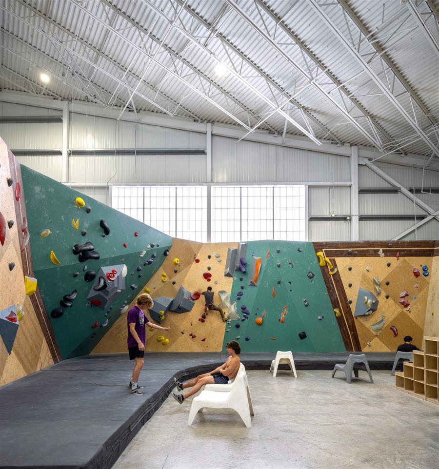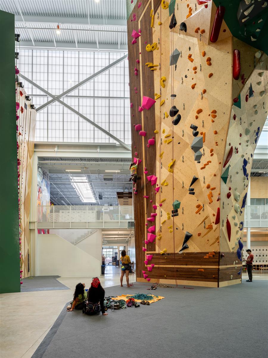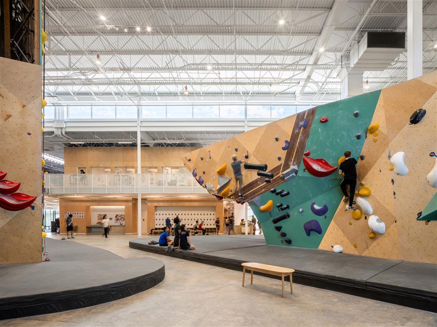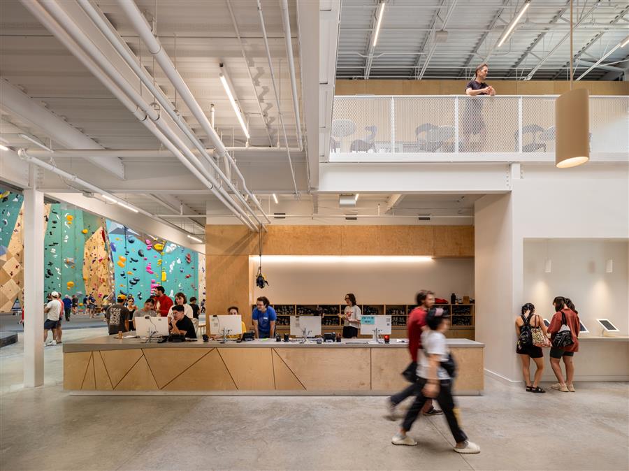 該設(shè)施擁有全面的配套設(shè)施,包括抱石區(qū)、符合國際標(biāo)準(zhǔn)的55英尺比賽攀巖墻、專門的兒童攀巖區(qū)、瑜伽和健身工作室、自由舉重區(qū)、零售空間和歡迎休息室。一個中央景觀庭院,由一個誘人的現(xiàn)場咖啡店固定,引入了郊區(qū)環(huán)境中不常見的行人友好的戶外空間,促進(jìn)社區(qū)互動,為游客提供一個充滿活力的社交環(huán)境。
