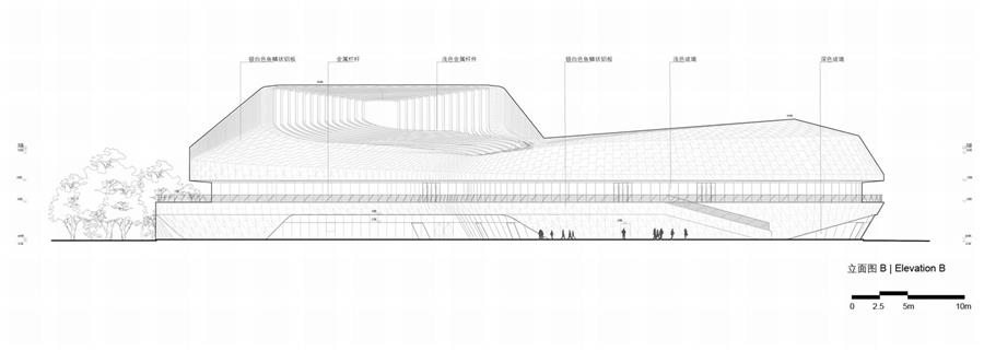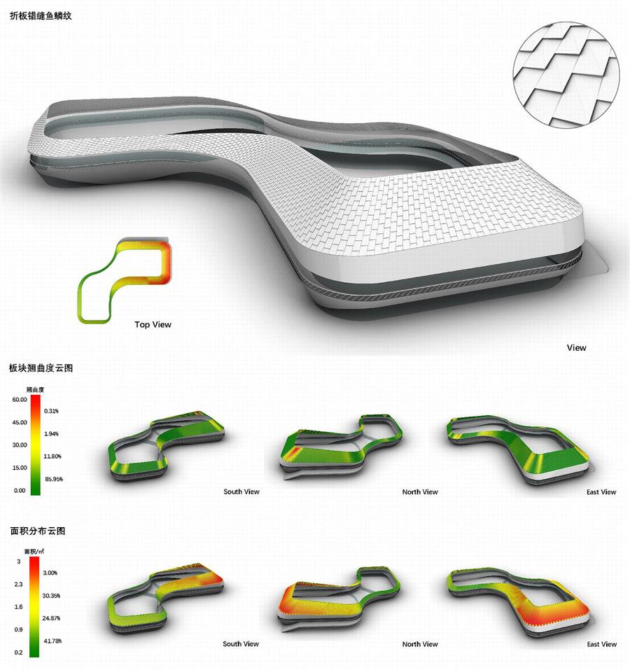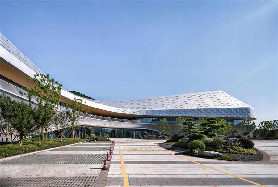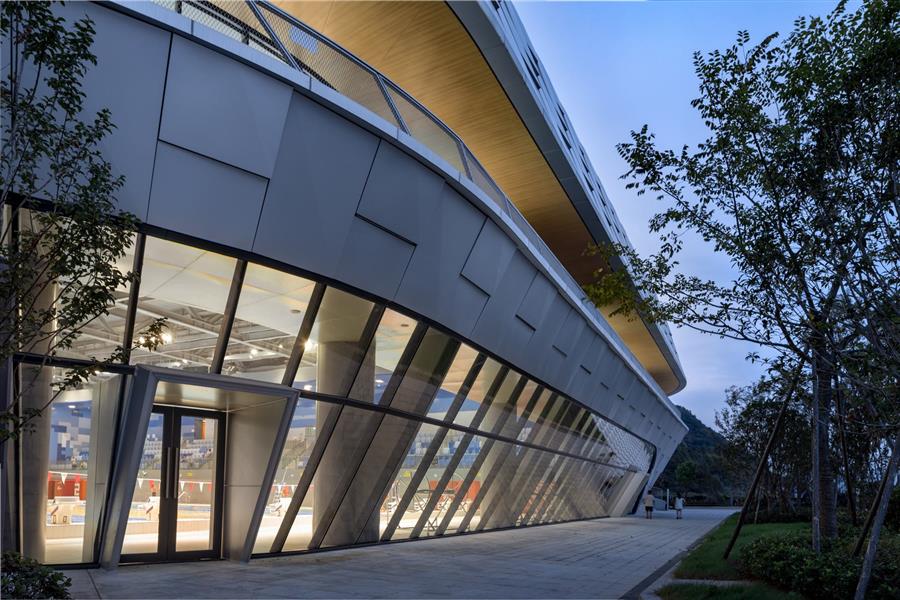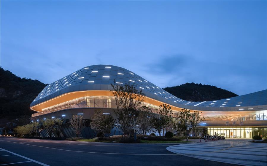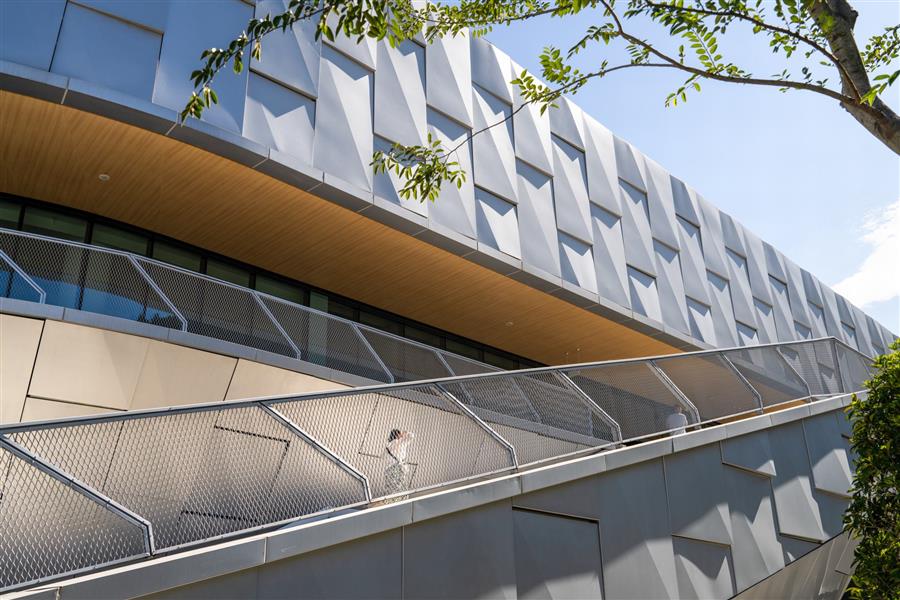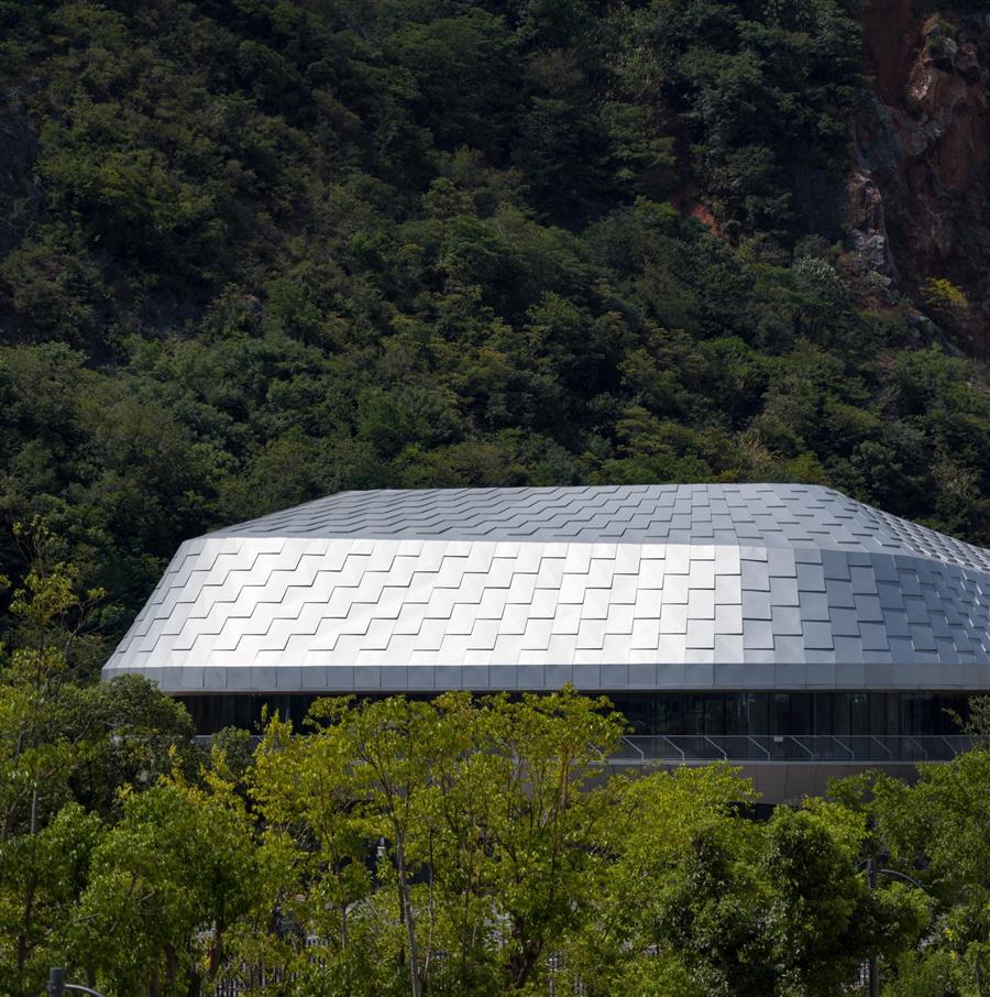 建筑外立面采用了以“折板錯(cuò)縫”為主的金屬魚鱗板系統(tǒng)。每塊金屬板表面均帶有一條角度變化的折痕,隨著立面曲率與陽光方向變化產(chǎn)生鱗片般的光影效果。這種由點(diǎn)、線、面多維組合而成的立面構(gòu)成方式,不僅提升了材料的肌理層次,也在視覺上進(jìn)一步強(qiáng)化了“水的流動感”與“山體的起伏感”。折板之間疏密變化的節(jié)奏,使連續(xù)立面在不同尺度上兼具統(tǒng)一性與動態(tài)表現(xiàn)力。