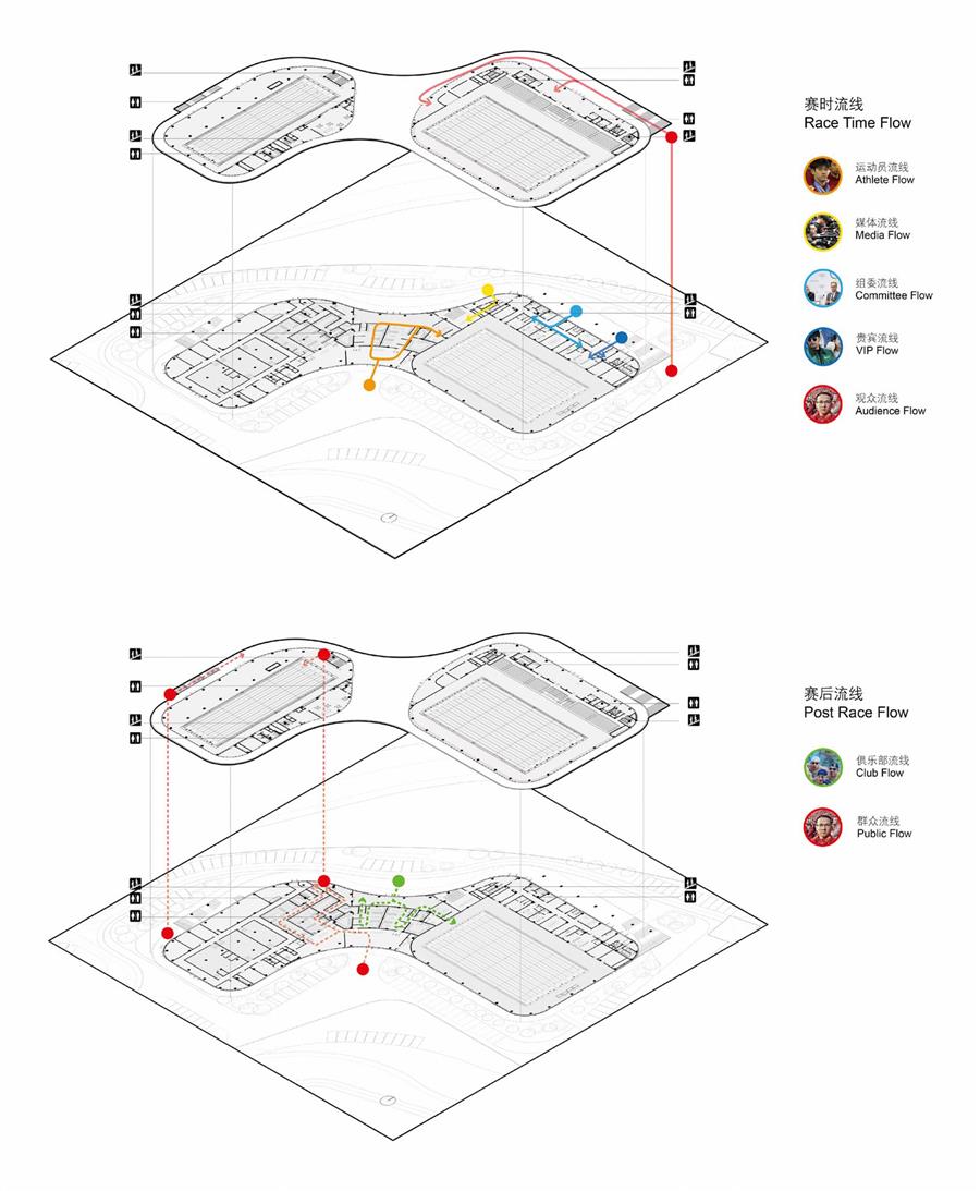 場館采用雙首層組織策略以優(yōu)化運(yùn)營與流線:常規(guī)使用中,觀眾與運(yùn)動員分別通過不同入口進(jìn)入各自區(qū)域;賽事期間,則通過二層看臺、專屬通道與功能房間實(shí)現(xiàn)觀眾、運(yùn)動員、媒體、組委及貴賓之間的分流,避免交叉干擾,提升運(yùn)營效率。