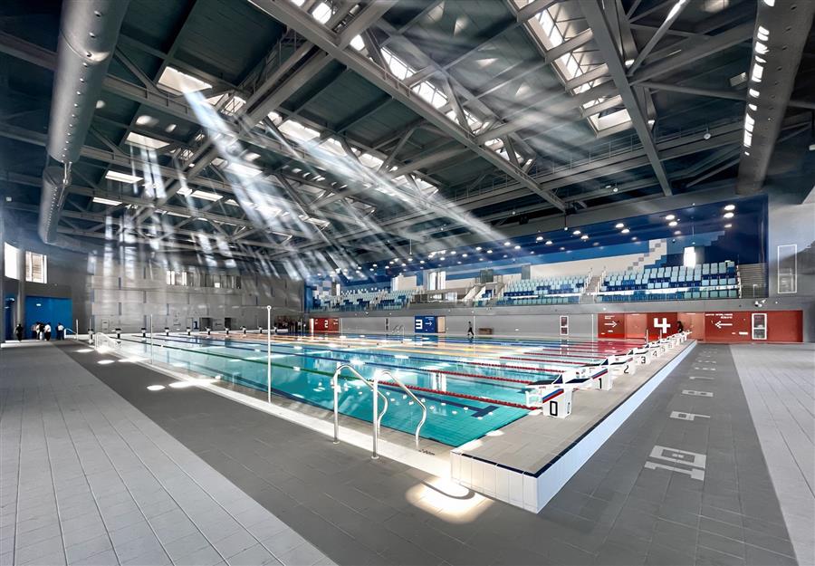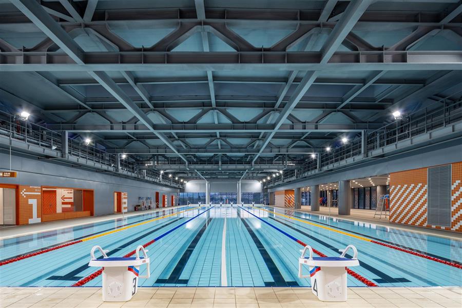 游泳館包含兩個(gè)標(biāo)準(zhǔn)泳池:一座長50米、寬25米的比賽池,設(shè)有8條泳道;一座長50米、寬17米的訓(xùn)練池,設(shè)有6條泳道,水深均為2米。兩池配置合理,可支持省級賽事及日常訓(xùn)練。