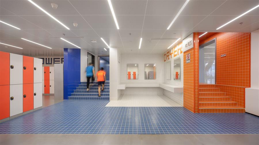 墻面與功能空間則采用彩色金屬板、氟碳涂層與穿孔構(gòu)件進(jìn)行組合,通過色塊劃分與局部撞色設(shè)計(jì)引入活力,豐富使用者的視覺體驗(yàn)。在保證空間統(tǒng)一感的同時(shí),設(shè)計(jì)試圖通過材質(zhì)與構(gòu)造的策略,構(gòu)建一個(gè)兼具功能性與識別性的日常體育空間。