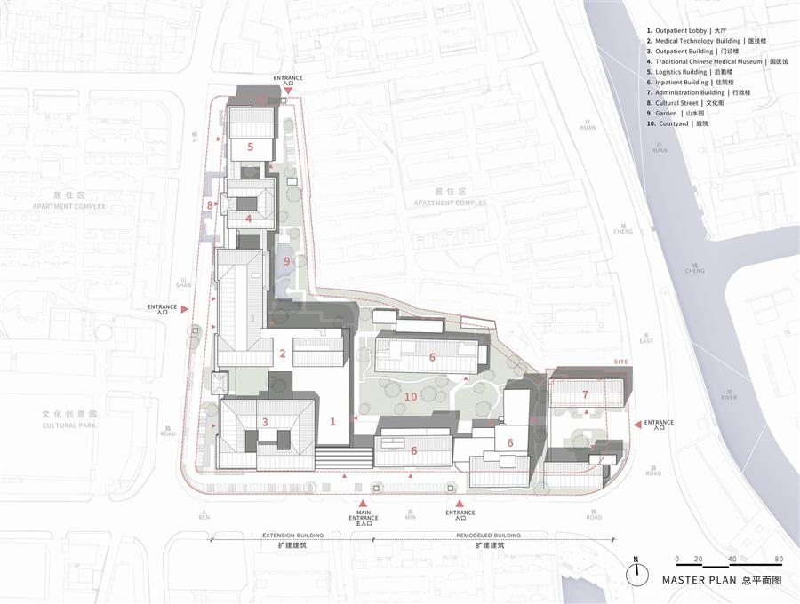 在我們的設(shè)計(jì)構(gòu)想中,紹興市中醫(yī)院不僅限于醫(yī)療功能,而是一片開放體驗(yàn)式的中醫(yī)文化街區(qū),它集中醫(yī)療法、藥膳展示與中醫(yī)藥文化教育于一體,多維發(fā)展越醫(yī)文化。