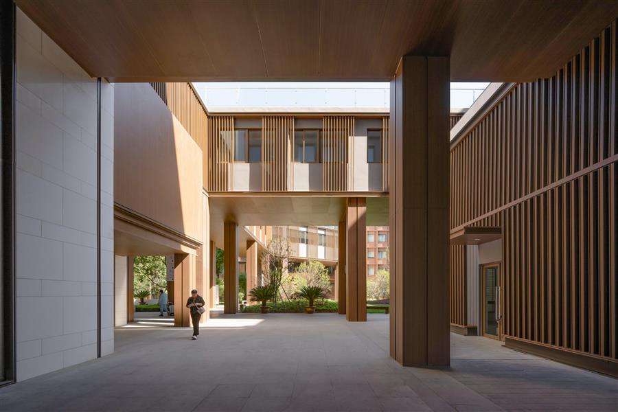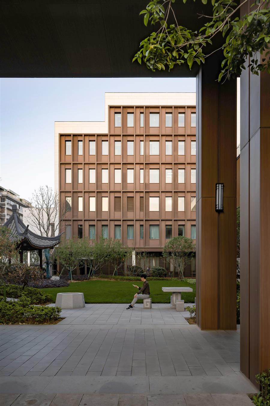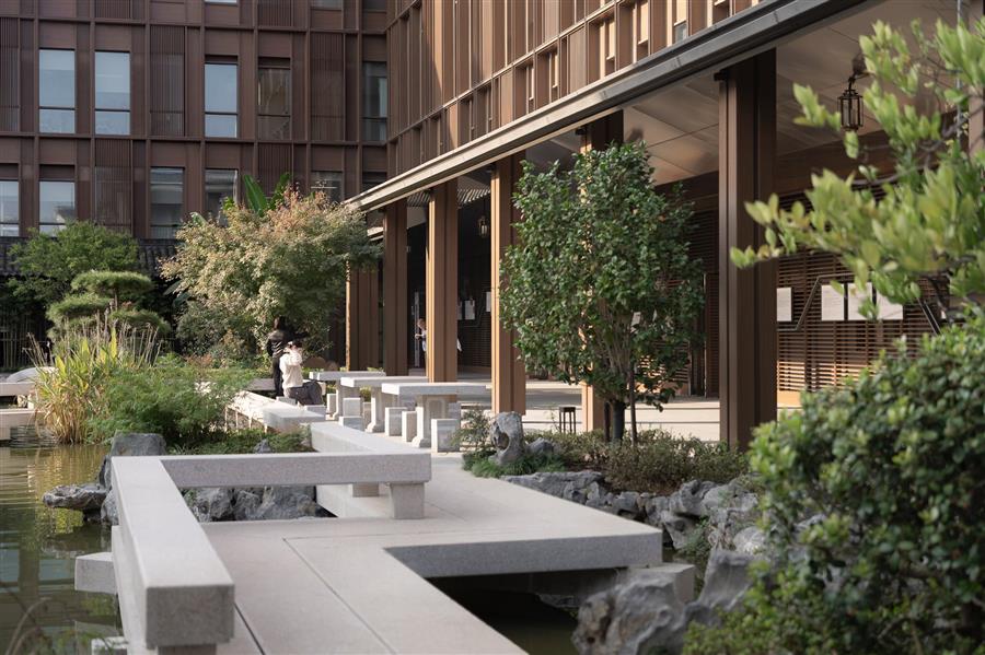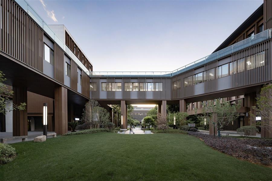 圍繞中心的山水園林,設(shè)計(jì)構(gòu)建出漫游式的院區(qū)流線,功能需求各不相同的建筑體量,彼此之間形成街巷、內(nèi)院與廣場,營造宜人尺度的市井氛圍。
