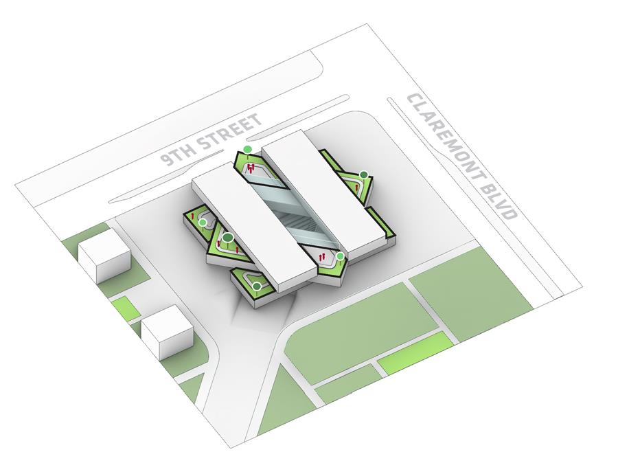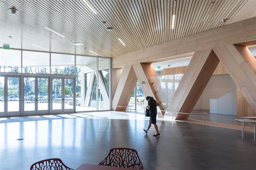 羅伯特·戴科學中心位于校園的東部邊緣,第九街和克萊蒙特大道的拐角處,可以看到禿頂山的景色,這為學校創(chuàng)造了一個新的門戶,并在戰(zhàn)略上促進了與其他學術部門的緊密聯(lián)系。一個戲劇性的15英尺高的懸停天篷歡迎學生、教授、員工和游客,將他們吸引到一個充滿生機和活力的天光多層次中庭。