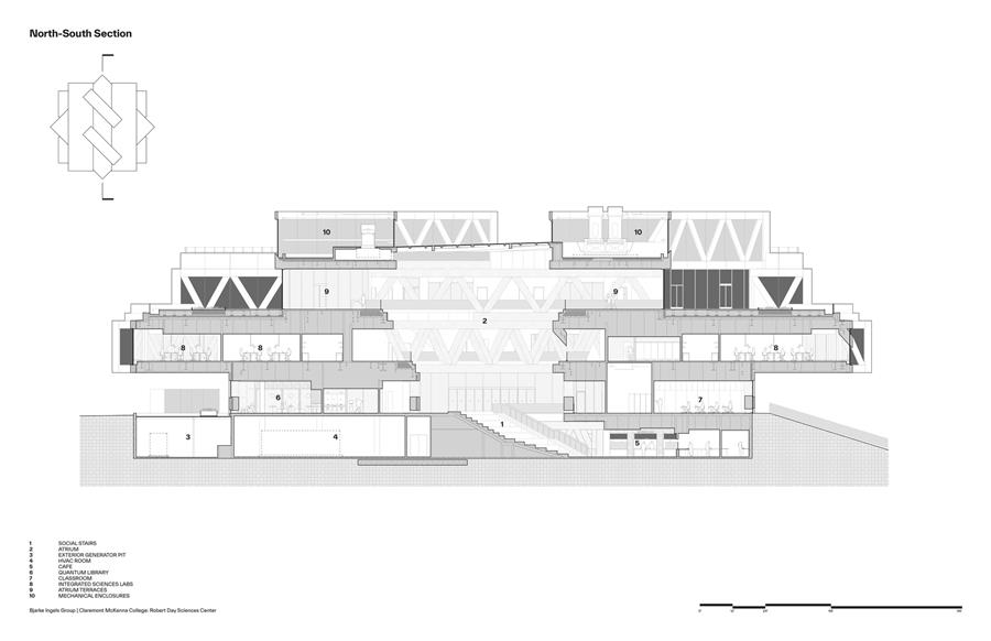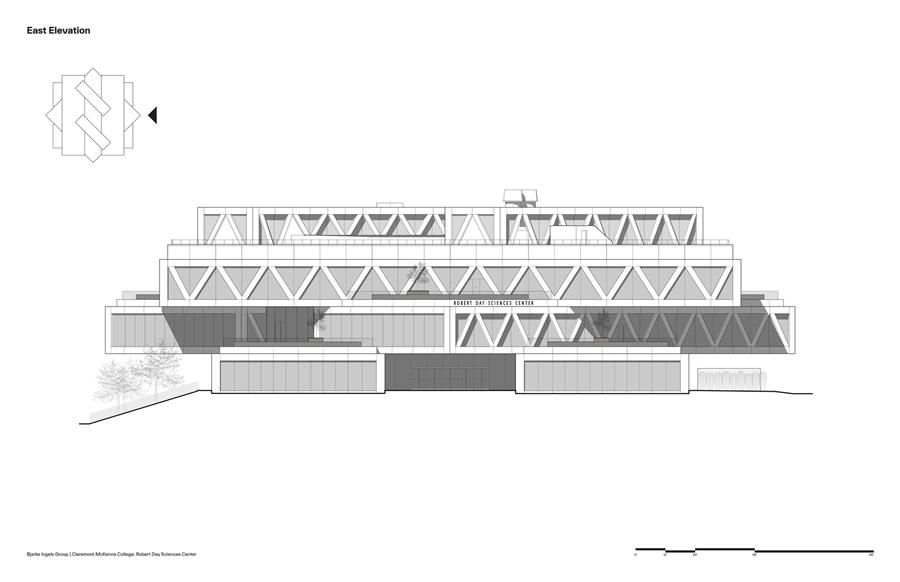 "The Robert Day Sciences Center brings together computer science, data science, and life sciences in one integrated environment. As the first completed building of our master plan for Claremont McKenna, it extends the north mall into a zigzag of malls, becoming a distributor of flows for the entire campus. We imagined the Sciences Center as a series of parallel building volumes side by side, with a public space in between, that are rotated in all the same directions as the mall. Even though each of the individual building volumes is rational, flexible, and capable of being computer labs or wet labs, the open atrium in between becomes a Piranesian social space where you can see fellow students, faculty, colleagues, and professors from every level. So even if you spend most of your time in a wet lab, computer lab, or classroom, there will still be many opportunities for sparks to fly between you and your fellow students, stimulating the exchange of ideas across the traditional silos of knowledge. In that sense, the Robert Day Sciences Center becomes a crucible where all of the different kinds of knowledge and all of the different kinds of students and teachers come together in one complex, three-dimensional learning environment." – Bjarke Ingels, Founder & Creative Director,