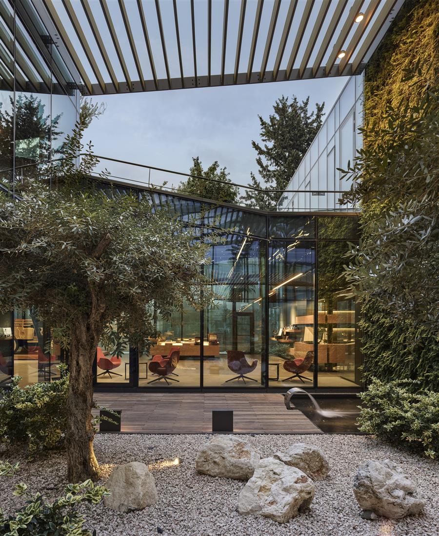 The multi-purpose metal perforated shell that completely surrounds the building is aimed to create inner gardens and green areas by changing the distances between the interior building. The shell also prevented the building from being directly exposed to sunlight, creating a more comfortable working environment in office spaces. By creating a green courtyard in the inner building, which includes archive, office, and exhibition areas, a green transition and air circulation were provided between all spaces. Resting and fresh air areas have been created for office staff by integrating pools in both gardens. This air circulation played an active role with the pools integrated into the gardens creating a gap for office staff to breathe.