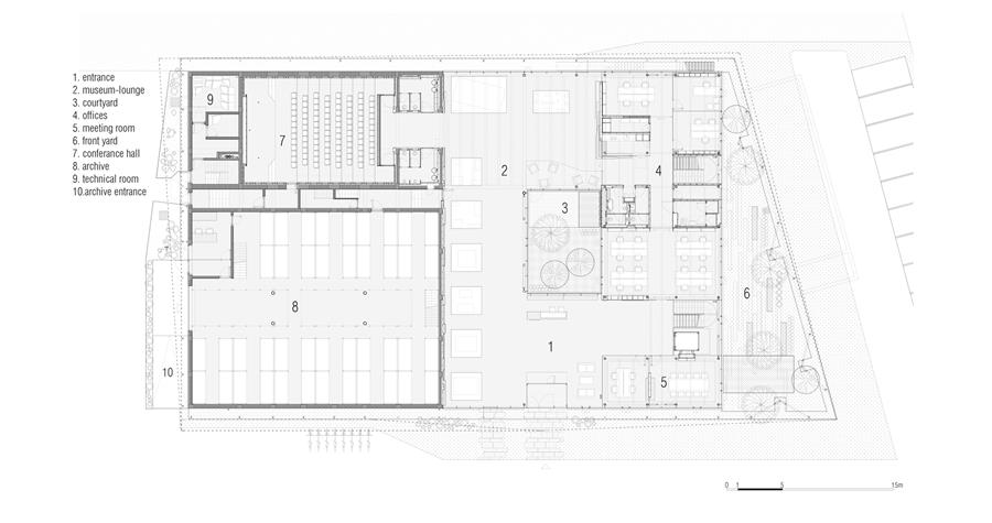 雖然檔案室被設(shè)計(jì)成一個(gè)自封閉的區(qū)域,但它是用鋼筋混凝土結(jié)構(gòu)建造的。另一方面,辦公室的設(shè)計(jì)將鋼結(jié)構(gòu)完全展示在建筑內(nèi)部,由透明玻璃幕墻支撐。在這個(gè)完全封閉和完全開放的項(xiàng)目的交匯處,博物館被放置為兩個(gè)不同項(xiàng)目的門廳和交匯點(diǎn)。展覽區(qū)和辦公室相互整合,圖書館設(shè)計(jì)在辦公室需要隔音的表面上,其余所有墻壁的前景都保持透明。這確保了空間在彼此之間流動(dòng),并且可以觀察到建筑內(nèi)部運(yùn)動(dòng)的連續(xù)性。