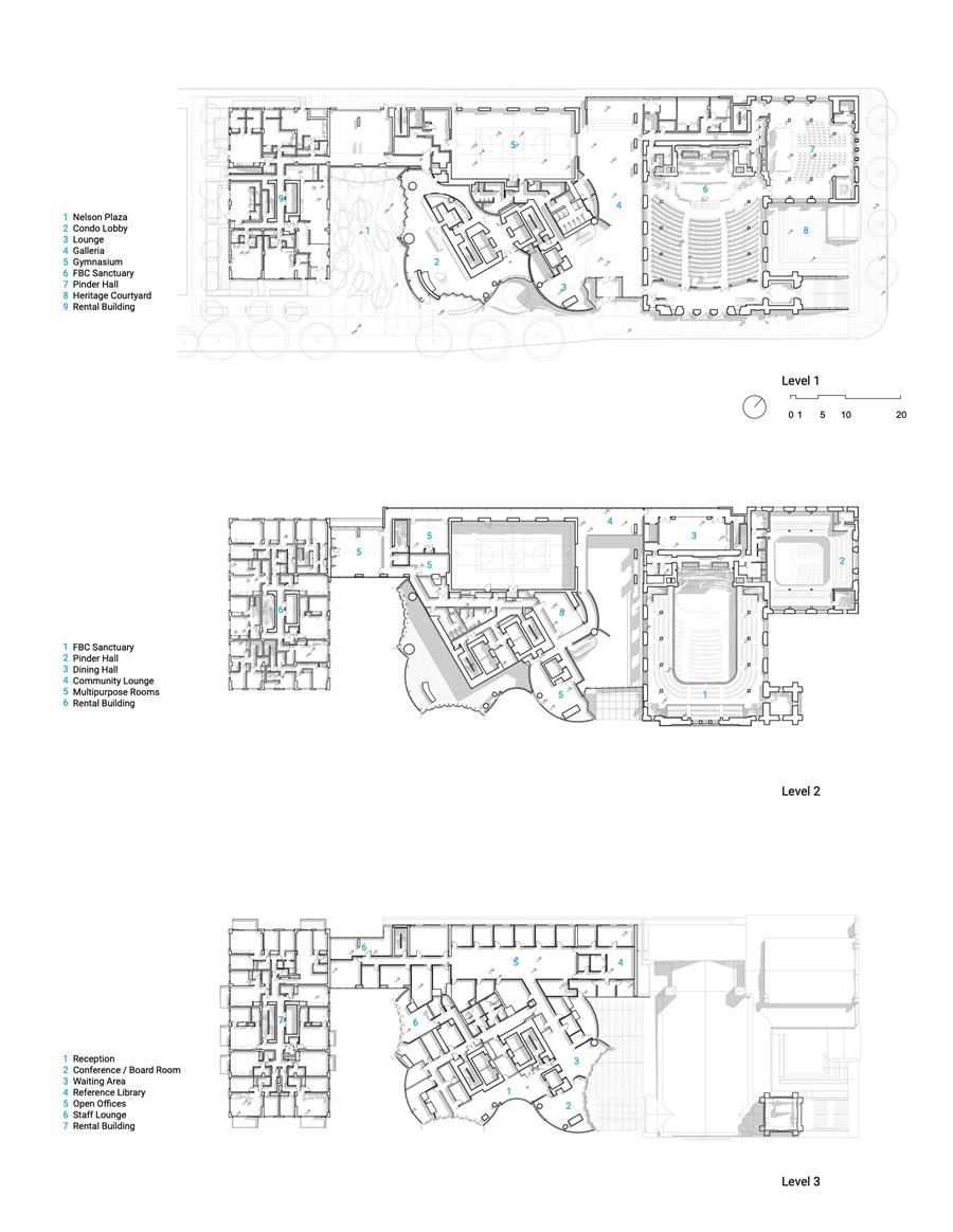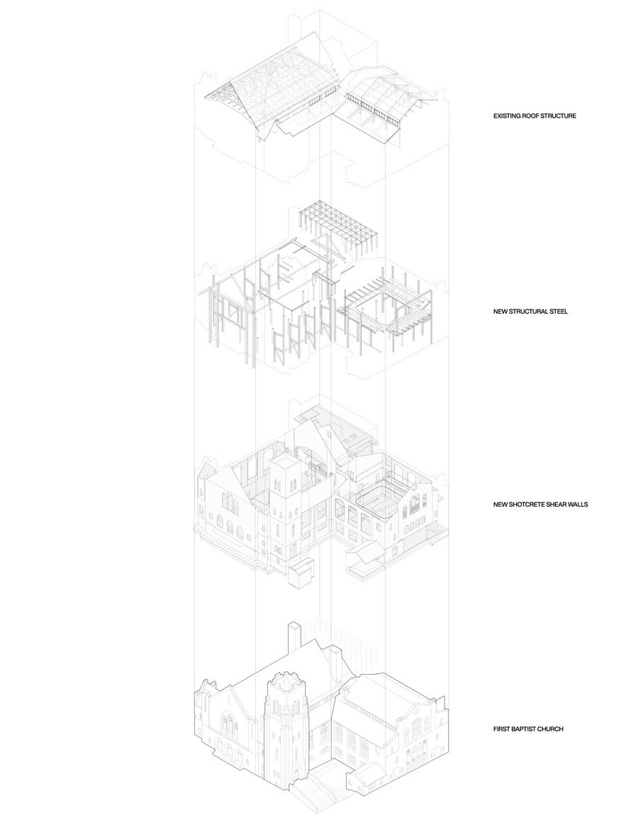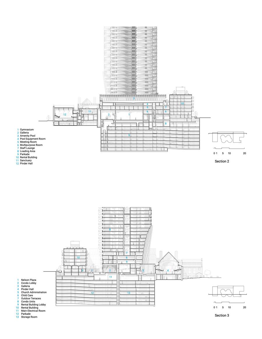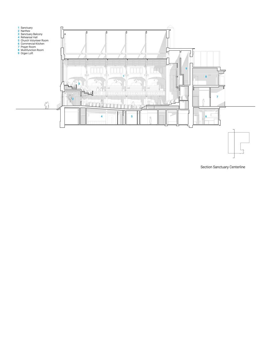 THE GALLERIA: BRIDGING PAST AND FUTURE — At the literal and conceptual center of the project is the galleria: a transparent, double-height atrium that links the heritage church with the tower podium. Its restrained steel and glass structure yields to the rough-hewn masonry of the church and the expressive curvilinearity of the tower, creating a dynamic space that brings to life a vibrant discourse between new/old, public/private, and interior/exterior. The galleria also serves a functional role. It is the entry point for many of the project's expanded community offerings, including a counselling center, childcare facility, multi-purpose rooms and state-of-the-art gymnasium. A grand stair, informal performance stage, and upper-level lounge animate the space throughout the day, supporting both programmed activity and spontaneous use.