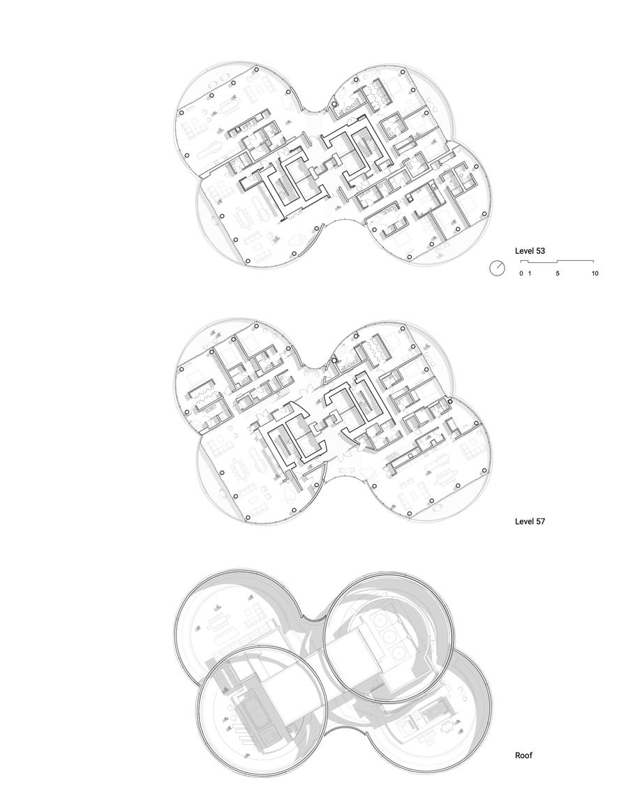 舒適的游泳池——一個50米高的游泳池連接著塔樓的第五層,為居民提供了一種身臨其境的、近乎空靈的體驗。泳池外殼由高性能玻璃覆蓋,并由36根預(yù)制模塊化肋骨支撐,將所有機械、電氣、照明和聲學(xué)系統(tǒng)集成并隱藏在其形式內(nèi)。在一個月的時間內(nèi),泳池結(jié)構(gòu)在現(xiàn)場組裝并吊裝到位,體現(xiàn)了模塊化、協(xié)調(diào)的設(shè)計建造執(zhí)行方法。游泳池位于場地的北側(cè),利用了鄰近塔的被動冷卻,最大限度地減少了機械需求,同時最大化了光線和視野。設(shè)計團隊進(jìn)行了詳細(xì)的冷凝研究,以驗證風(fēng)扇和通風(fēng)口的位置,以獲得最佳氣流,在不破壞外殼透明度的情況下確保熱舒適性。結(jié)果是一個既精確又平靜的屋頂休憩所——一個健康、反思和社區(qū)的建筑焦點。