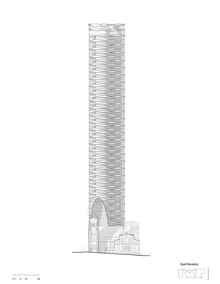 蝴蝶的有機形式以優(yōu)雅和神韻回應(yīng)其城市和自然環(huán)境。受蝴蝶的美麗和轉(zhuǎn)化精神的啟發(fā),其立面由起伏的白色GFRC(玻璃纖維增強混凝土)面板和彎曲的高性能玻璃組成,編織出復(fù)雜而和諧的上升到云層。陽臺和共享的空中花園鼓勵被動冷卻,并提供全景。平臺的頂部是一個50米的游泳池,它被一個透明的天篷包裹著,由雕塑的肋骨支撐,這是一個工程壯舉,將照明、聲學(xué)和機械系統(tǒng)集成在一個富有表現(xiàn)力的姿態(tài)中。從基礎(chǔ)到頂部,建筑富有表現(xiàn)力的設(shè)計掩蓋了其精心調(diào)整的技術(shù)性能。該綜合體將一個突出的市中心場地重新構(gòu)想為一個混合收入、混合用途、可再生的垂直社區(qū)。Revery、Westbank和第一浸信會教堂之間的合作利用教堂土地作為互惠的城市干預(yù),保護和提升遺產(chǎn),造福社區(qū),并提供高質(zhì)量的都市生活。教堂、塔樓和中層出租建筑共同構(gòu)成了一個分層的城市景觀——部分是地標(biāo),部分是生活系統(tǒng)。