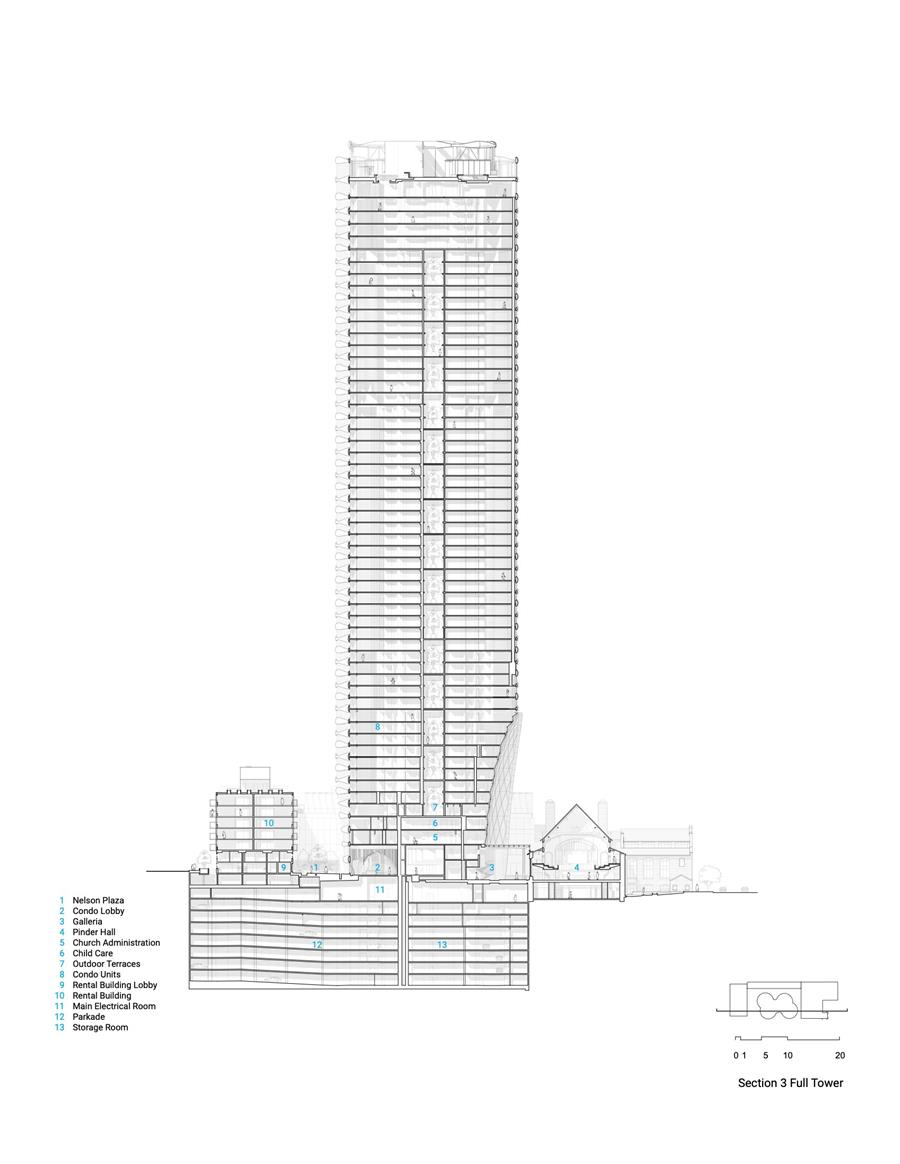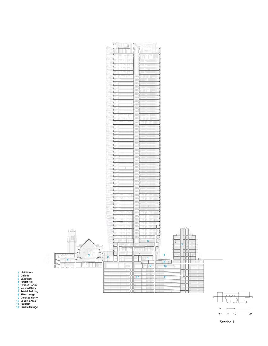 A VERTICAL COUNTERPART — While the church remains the symbolic heart of the site, the Butterfly tower introduces a human-centered approach to high-rise living. Its gently undulating form and split floorplate create a stack of open-air breezeways and lush sky gardens at every level, offering residents moments of connection to nature, the city, and one another. The tower's base is carved back to make room for courtyards, plazas, and ground-level greenery, creating a soft threshold between the commercial Burrard Corridor and the residential West End. A new public lane and upgraded landscape further embed the development into the fabric of the neighborhood. Built to LEED Gold standards, the tower incorporates an insulated precast envelope, low-carbon district energy system, high-efficiency fan coils, and operable windows. The building targets a 68–85% reduction in greenhouse gas emissions compared to the baseline — a remarkable feat given its scale. Notably, emissions reductions be% are achieved through the use of renewable energy sourced from its on-site district energy system.