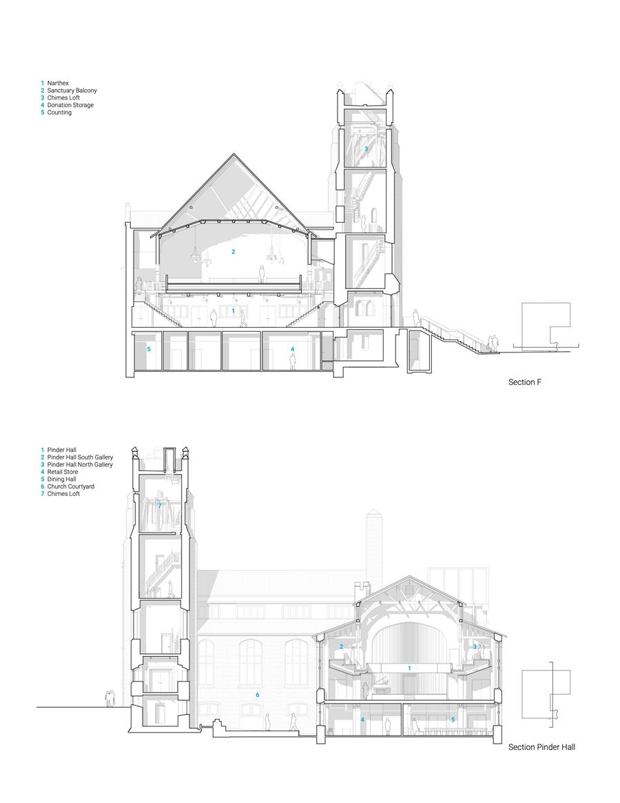 次要的集會空間,Pinder Hall,完全重生了。之前的翻新在夾層增加了一個底層,以創(chuàng)造額外的活動空間,模糊了全高的彩色玻璃窗,并使空間的特征變得柔和。Revery的修復(fù)工作恢復(fù)了原有的雙層體量,并采用了干凈的當(dāng)代室內(nèi)色調(diào),讓傳統(tǒng)元素占據(jù)中心舞臺。原來的迪根編鐘,休眠了幾十年,由北美唯一剩下的專家恢復(fù)了工作秩序??蛇_(dá)性也得到了有意義的解決,通過一個新的合理的地下室,以及兩個新電梯和坡道的戰(zhàn)略整合,提供了所有空間的通用通道,包括大廳的主要舞臺。