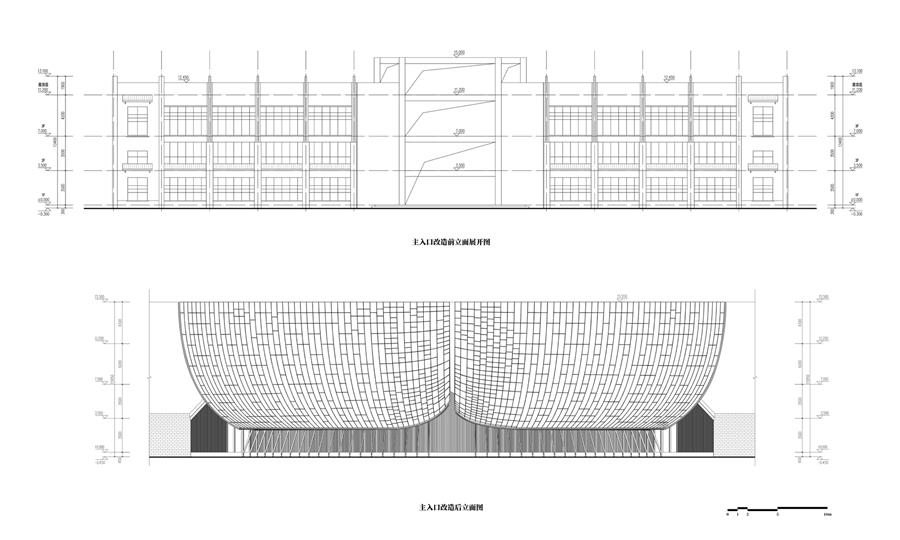 主要的挑戰(zhàn)是改造這個(gè)最初設(shè)計(jì)為酒店的超大建筑,以更好地適應(yīng)這個(gè)千年水鄉(xiāng)的規(guī)模和氛圍。設(shè)計(jì)不僅需要回應(yīng)文化象征,還需要結(jié)合觀眾流通、設(shè)備進(jìn)出等實(shí)際的表演后勤。我們沒(méi)有將建筑覆蓋在傳統(tǒng)的圖案中,而是引入了“窗簾”這個(gè)概念,這是一個(gè)視覺(jué)和隱喻都有效的概念。兩塊彎曲的、像窗簾一樣的鋁板輕輕地掩蓋了原來(lái)的形式,創(chuàng)造了一個(gè)明亮、開(kāi)放的印象。抬高的入口暗示著戲劇的期待,而后面的黑暗走廊形成了一個(gè)讓人想起中國(guó)傳統(tǒng)山墻屋頂?shù)募粲?,為現(xiàn)代干預(yù)提供了一個(gè)文化錨。