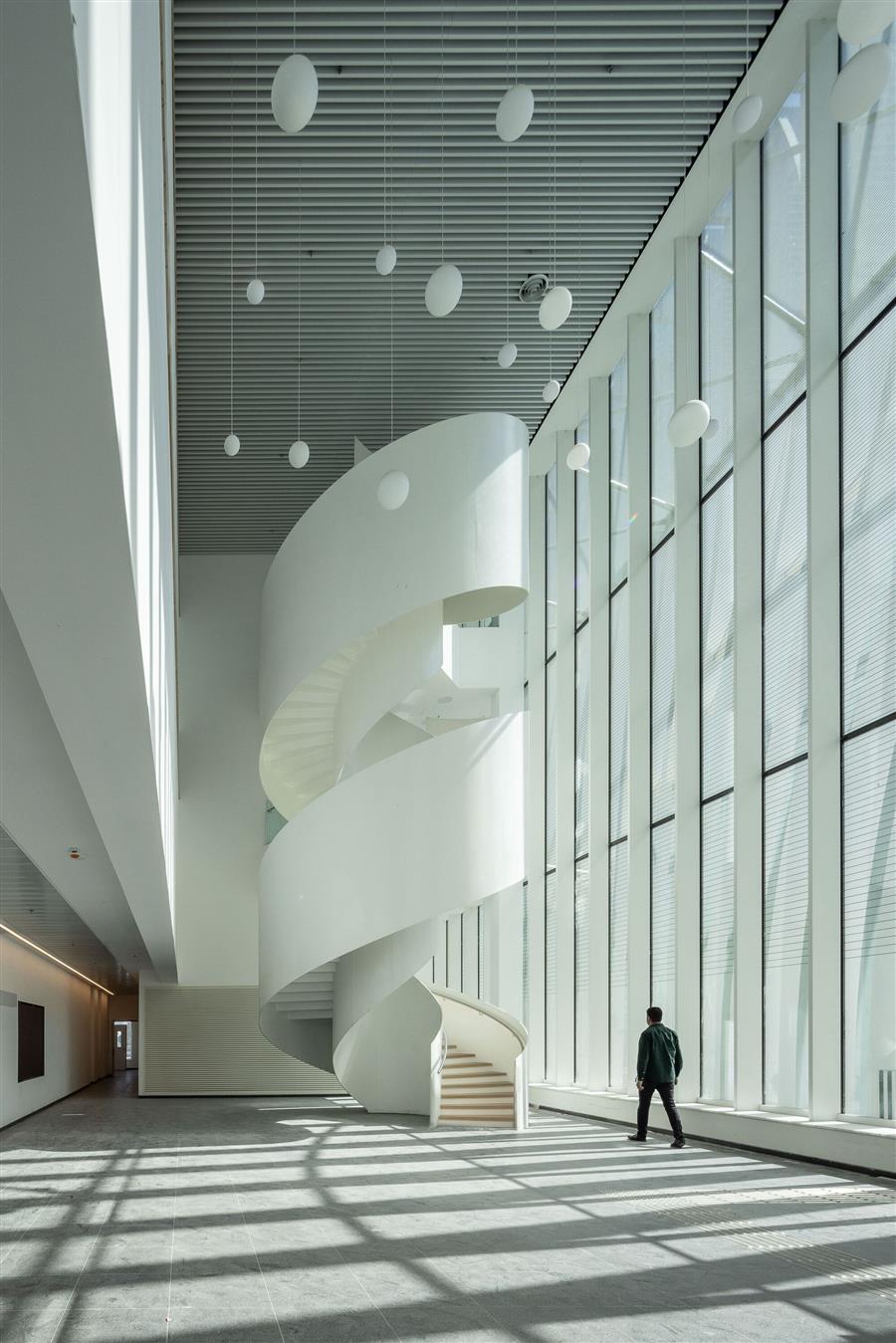 圍繞這個(gè)中心核心是一個(gè)沐浴在日光下的大型循環(huán)環(huán)。一個(gè)研究科學(xué)家可以交流和見面的空間。一個(gè)優(yōu)雅的白色螺旋樓梯從大廳升起,隱藏了后面的電梯。它邀請(qǐng)你漫步,象征著行走是科學(xué)發(fā)現(xiàn)背后的驅(qū)動(dòng)力。