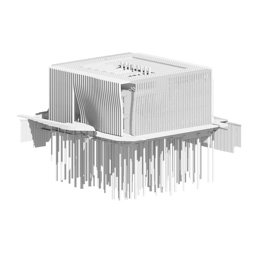 Our architectural concept explores multiple dimensions of scale: the infinitely small; the human scale; and occasionally, the elimination of any reference to scale. The external skin is composed of a matrix of vertical elements that defy conventional architectural references. Windows and doors give way to an abstract background where the structure itself becomes its language.