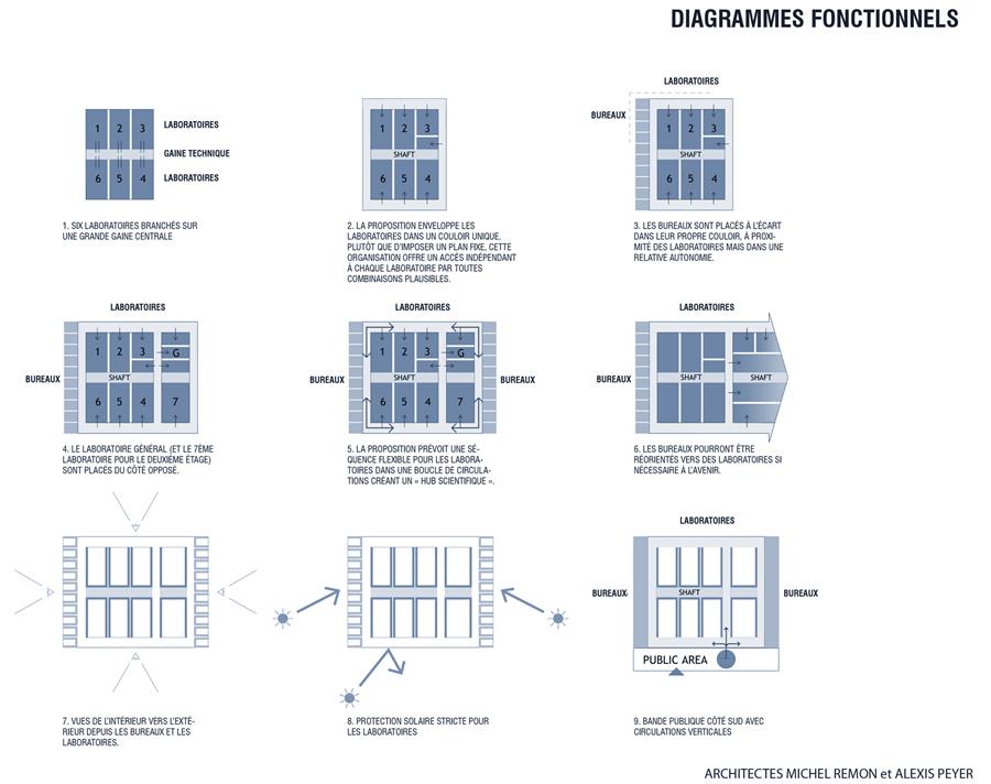 國(guó)際評(píng)審團(tuán)贊揚(yáng)了我們項(xiàng)目的幾個(gè)特點(diǎn):外部外殼的優(yōu)雅設(shè)計(jì)與校園的建筑環(huán)境完美和諧;平面的清晰,既簡(jiǎn)單又復(fù)雜,便于內(nèi)部流通;以及控制進(jìn)入實(shí)驗(yàn)室的巧妙解決方案。