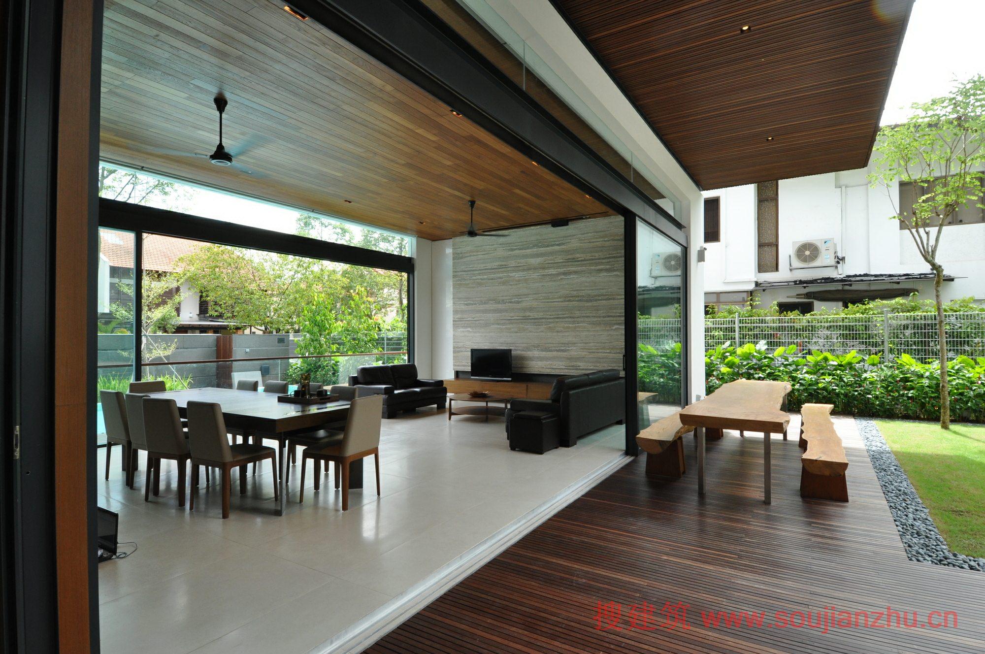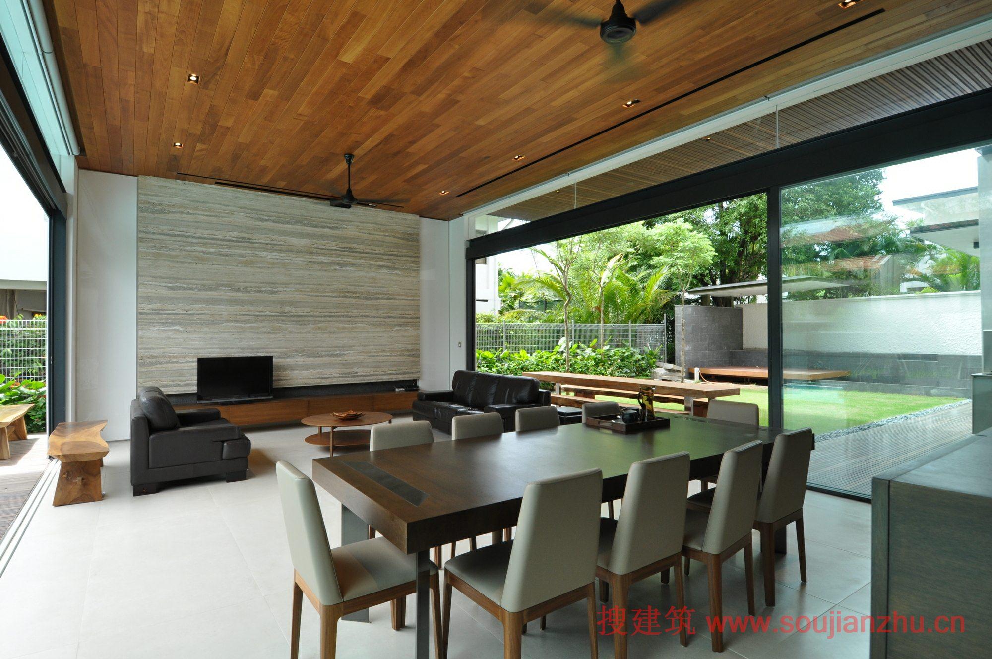 合并起居室和餐廳形成一個開放性的展館空間經(jīng)驗,一邊是自然水域一邊是綠色景觀。高3.6米柚木木材天花板,允許的最大光進入生活空間和良好的自然通風(fēng),當(dāng)所有的滑動玻璃門都打開的時候。作為一個結(jié)果,房屋內(nèi)部充滿了光明和空氣,使熱帶氣候的新加坡有一個舒適的生活經(jīng)驗。雨水通過大型懸垂鋁制屋頂收集到海灣,屋頂同時也提供了充足的陰影。