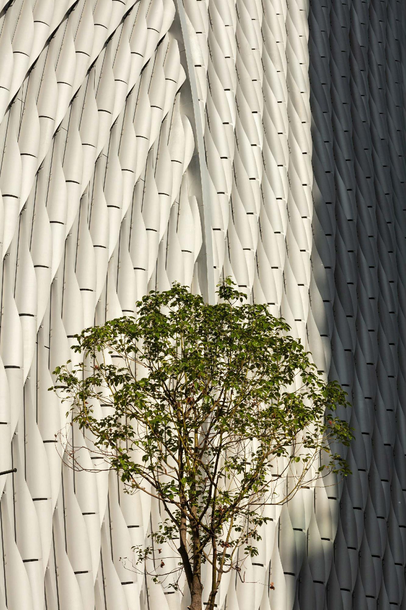 戲曲中心閃閃發(fā)亮的外立面上,由CNC切割的航海級(jí)鋁管構(gòu)成的模塊化系統(tǒng)為建筑賦予了優(yōu)質(zhì)的性能和引人注目的外觀,并沿著建筑交替排布,使建筑看上猶如舊時(shí)在珠簾背后閃爍的燈籠。立面上的金屬“幕布”在四個(gè)拐角的入口處輕輕拉起,使光線溢出室外,同時(shí)向街道展示出人來(lái)人往、充滿活力的內(nèi)部庭院,吸引著人們前來(lái)欣賞展覽和音樂(lè)、逛街、或者觀看戲曲游行。