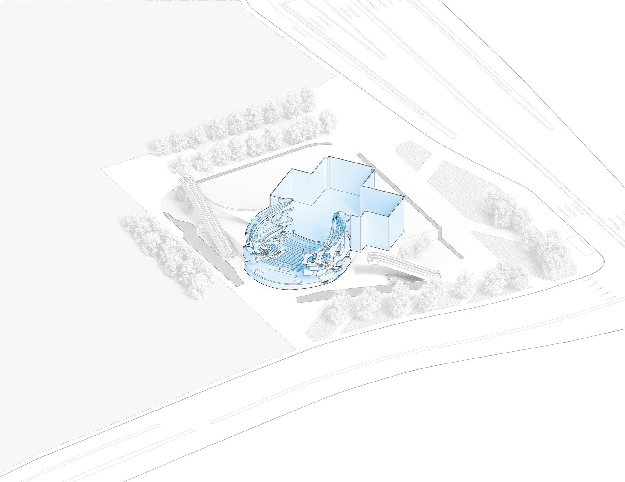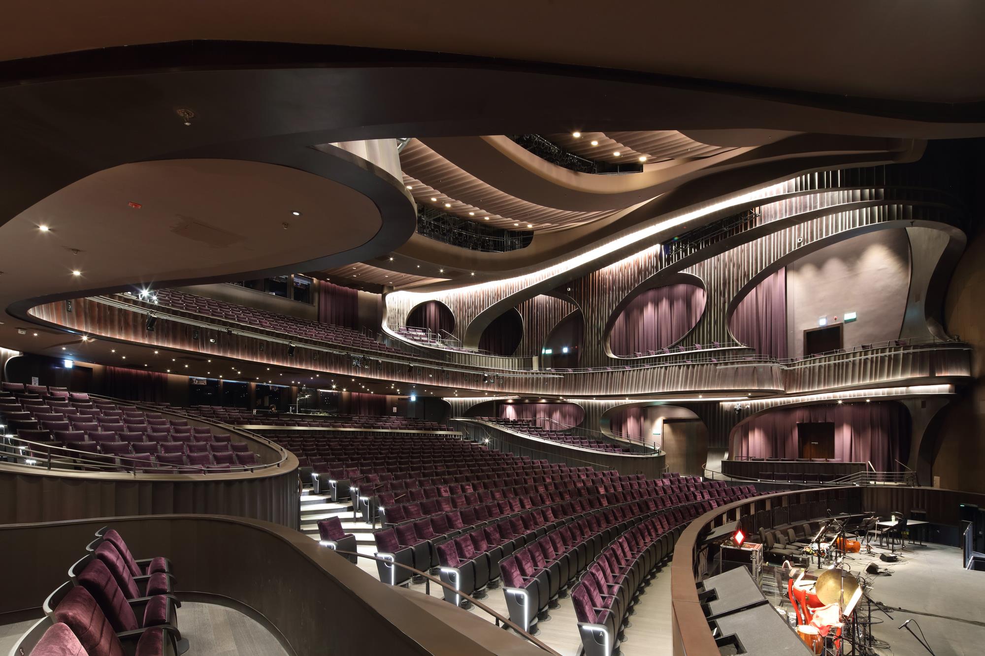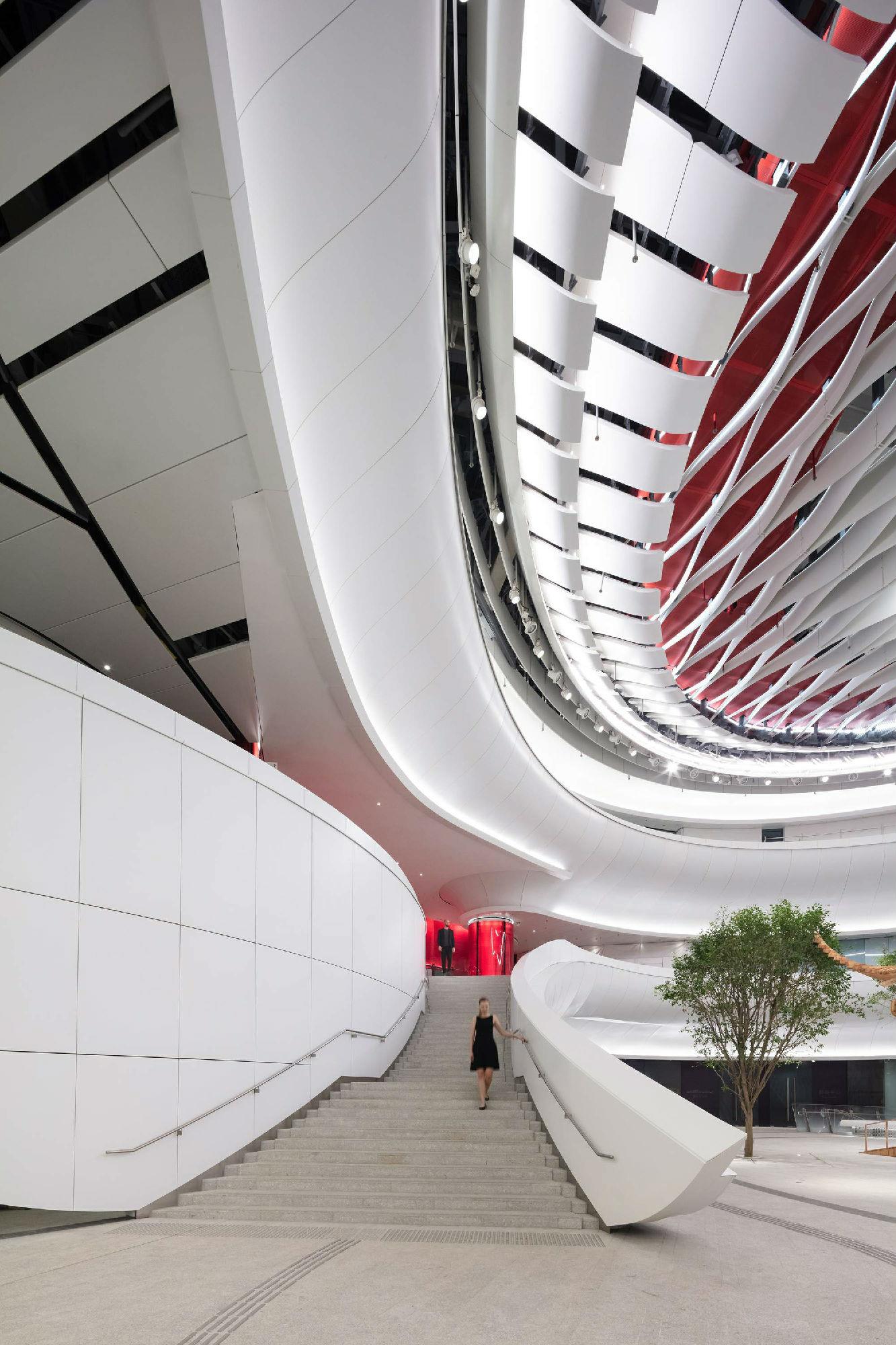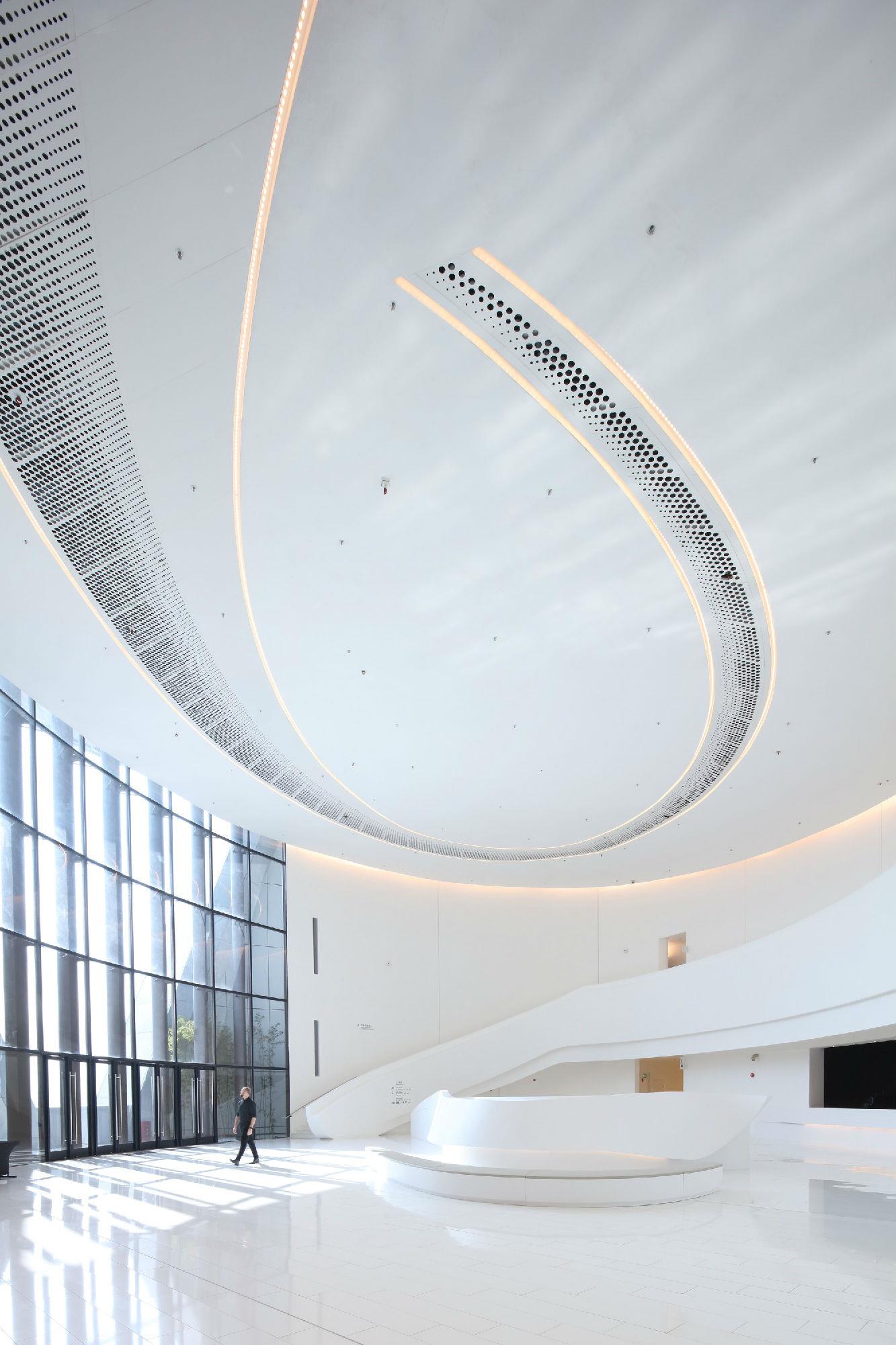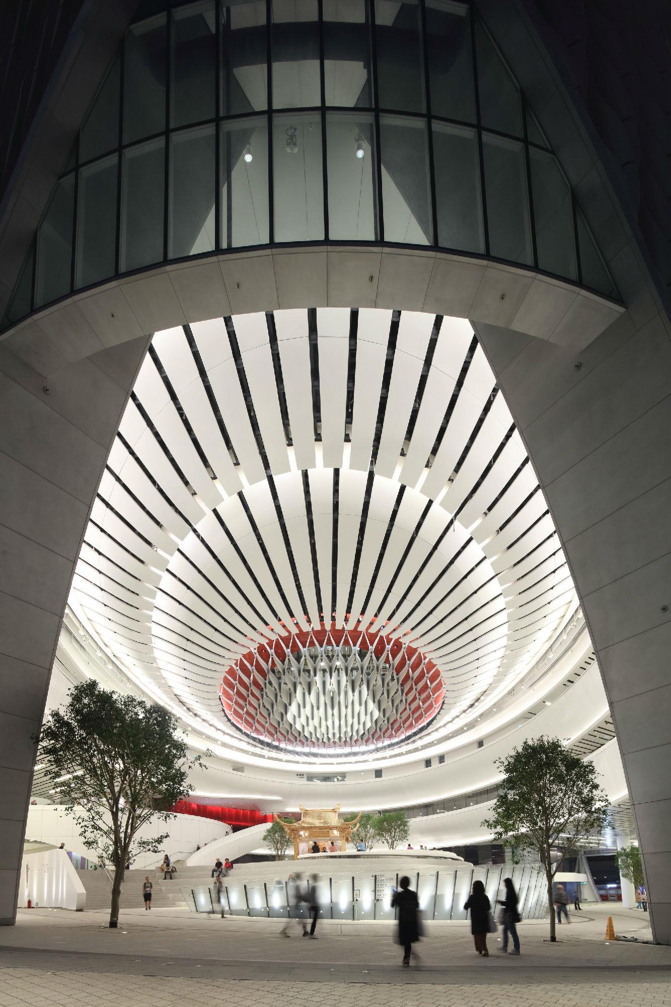 “氣”(意為流動(dòng))通過(guò)曲線路徑和形式表達(dá)在整個(gè)綜合體中,圍繞一個(gè)迷人的、多層次的圓形中庭設(shè)計(jì)了拱形入口。大劇院巧妙地“懸浮”在首層空間上方90英尺(27米)的位置,從而將禮堂與喧鬧的城市環(huán)境分隔開,避免了噪音帶來(lái)的干擾。戲曲中心的設(shè)計(jì)使建筑能夠安全地在劇院內(nèi)部和下方同時(shí)進(jìn)行,從而縮短了施工時(shí)間。