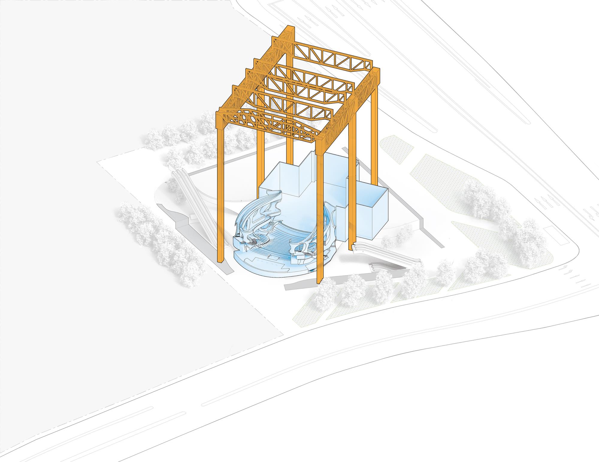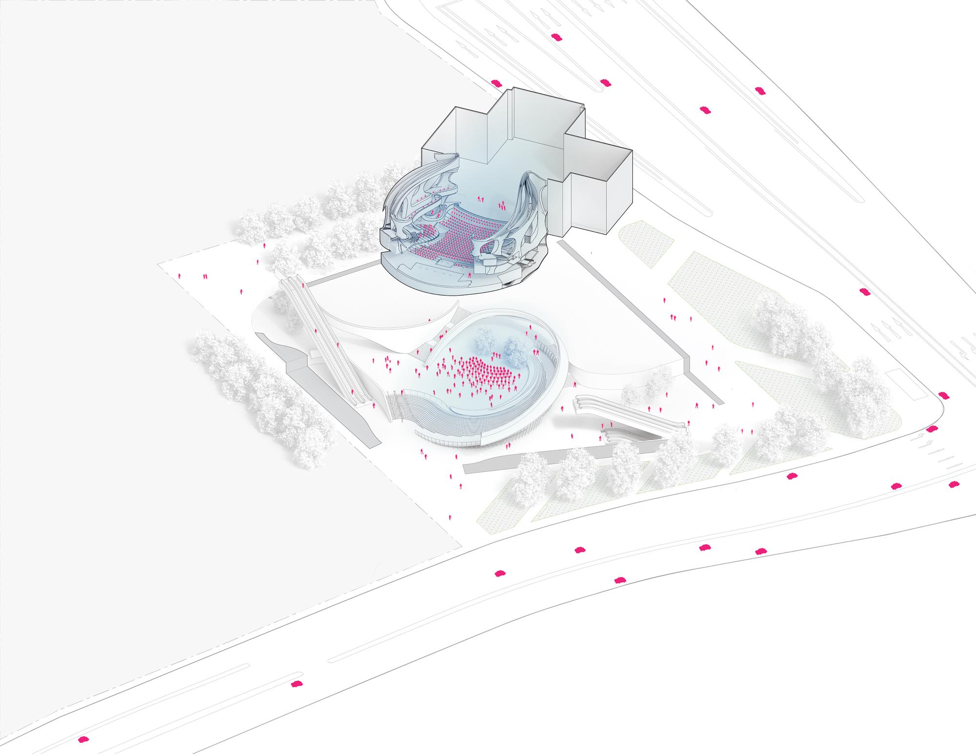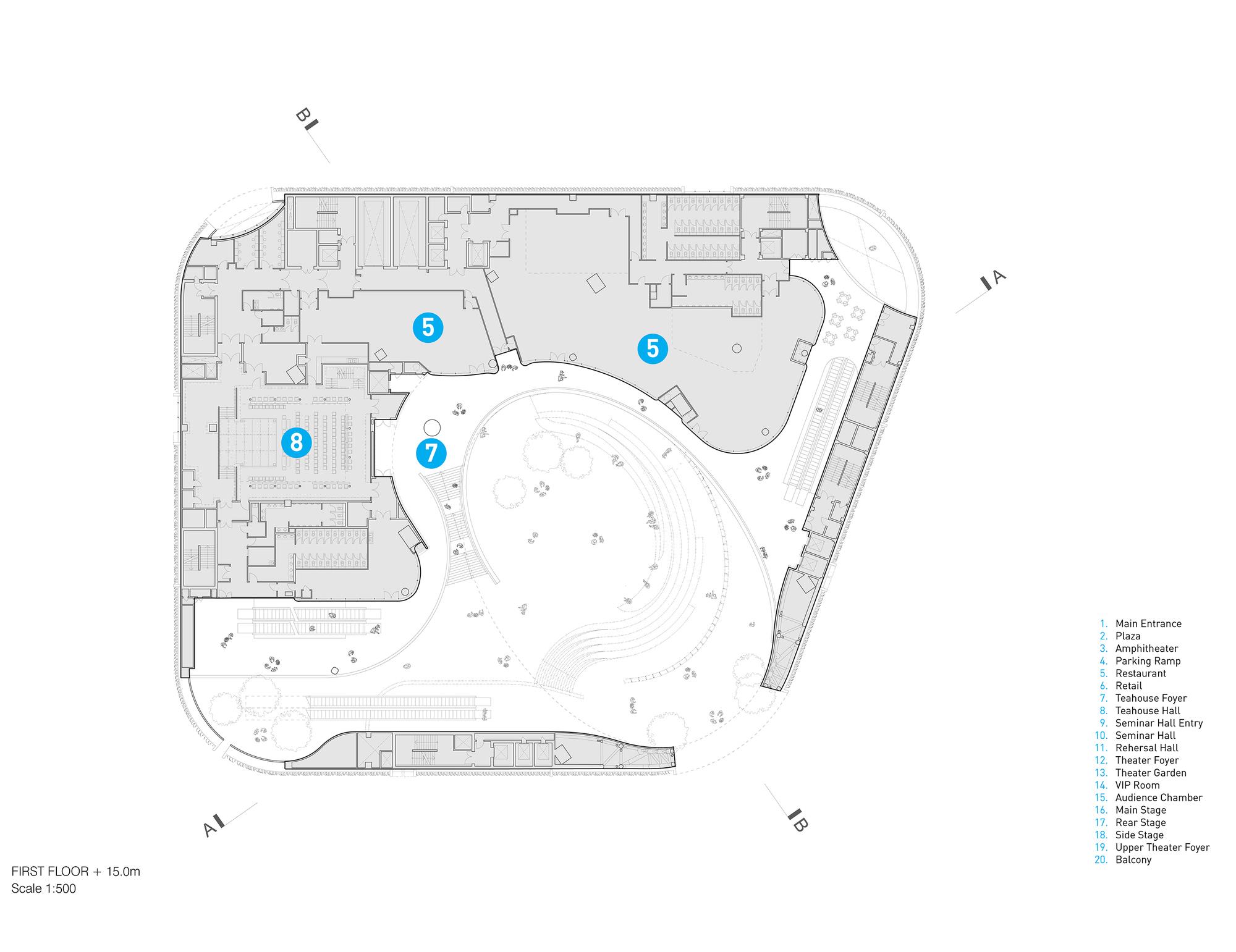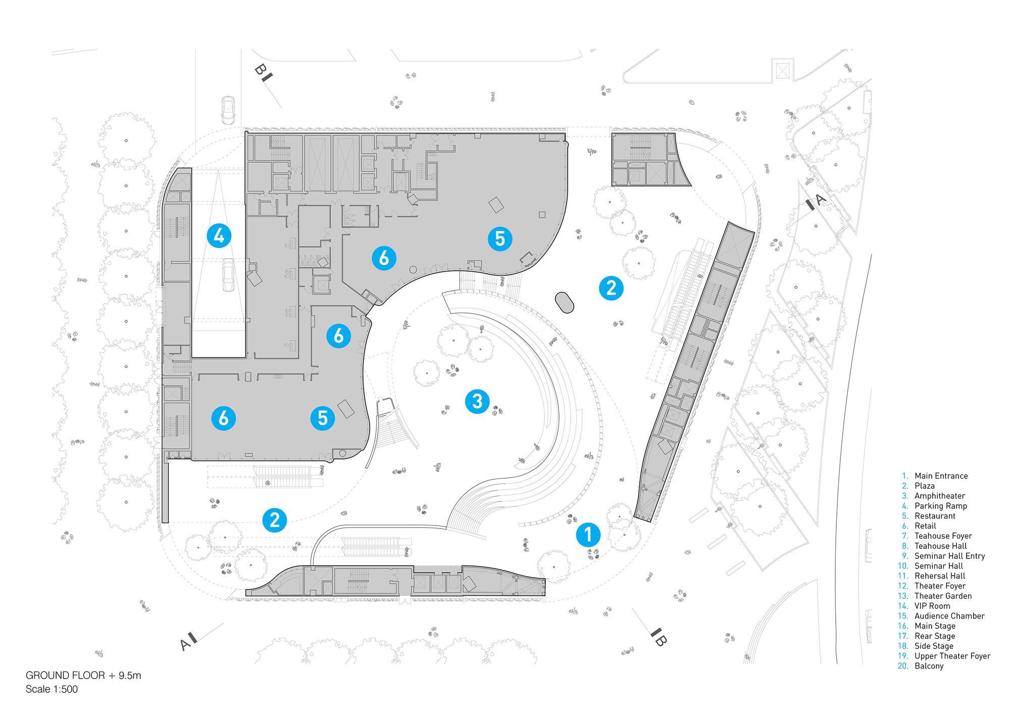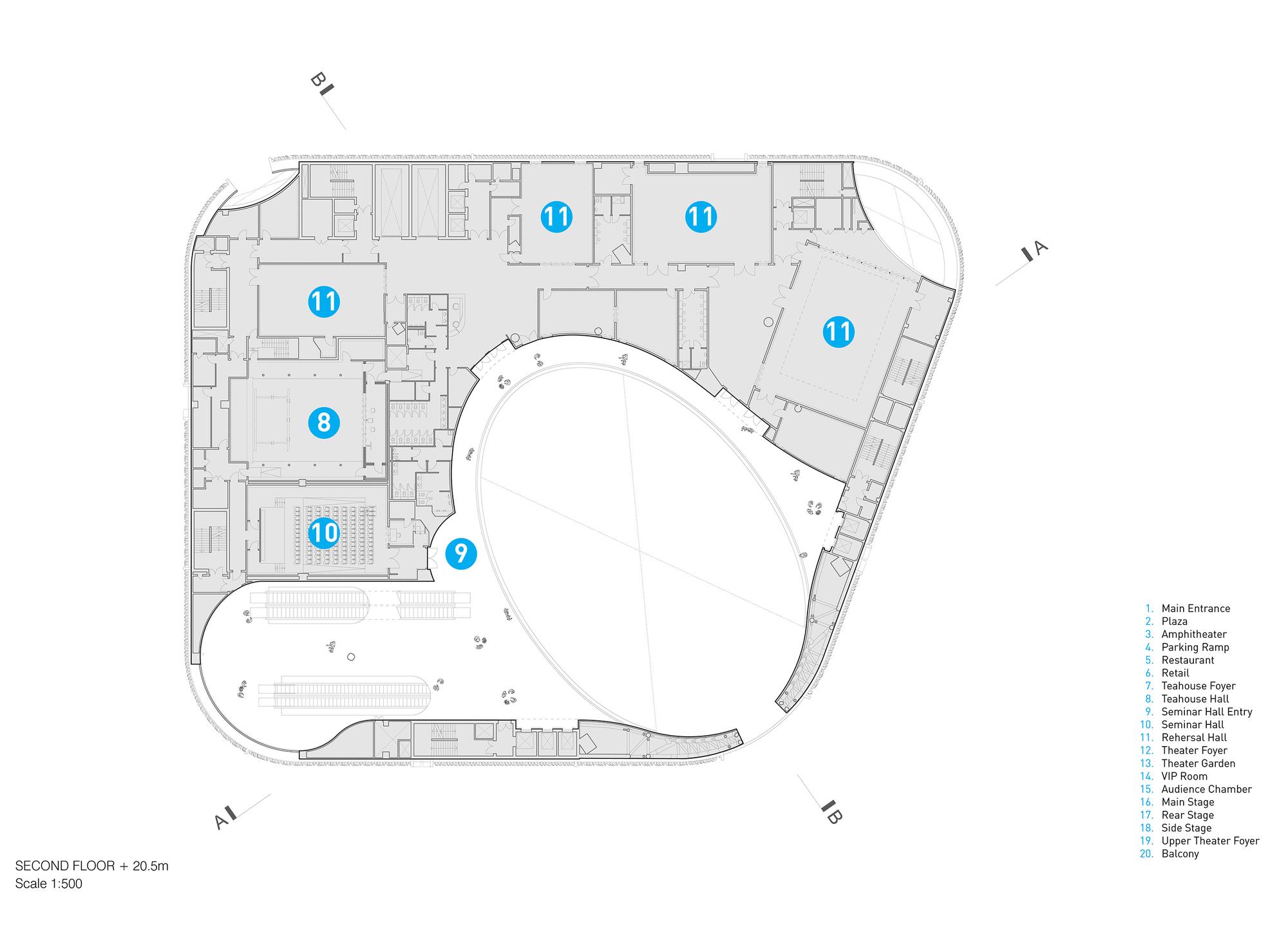 “氣”(意為流動(dòng))通過(guò)曲線路徑和形式表達(dá)在整個(gè)綜合體中,圍繞一個(gè)迷人的、多層次的圓形中庭設(shè)計(jì)了拱形入口。大劇院巧妙地“懸浮”在首層空間上方90英尺(27米)的位置,從而將禮堂與喧鬧的城市環(huán)境分隔開,避免了噪音帶來(lái)的干擾。戲曲中心的設(shè)計(jì)使建筑能夠安全地在劇院內(nèi)部和下方同時(shí)進(jìn)行,從而縮短了施工時(shí)間。