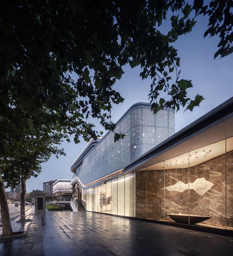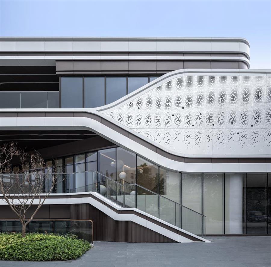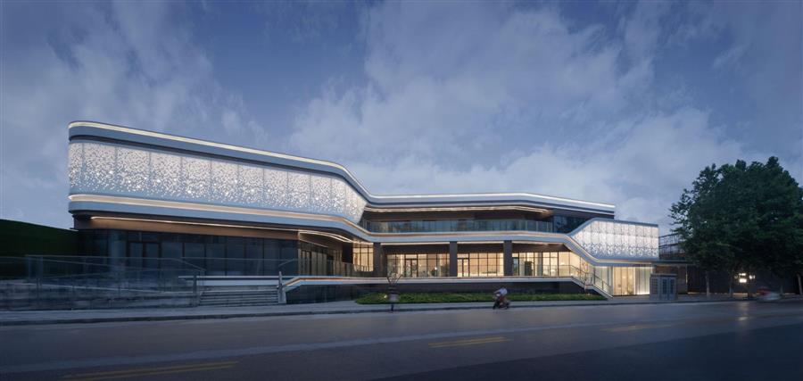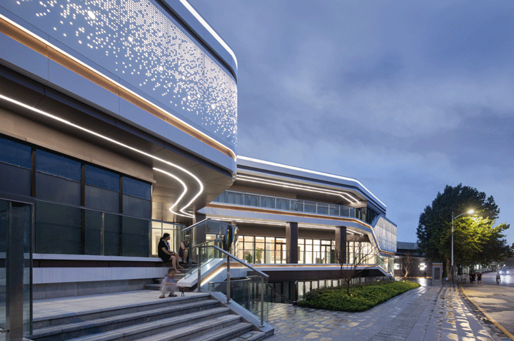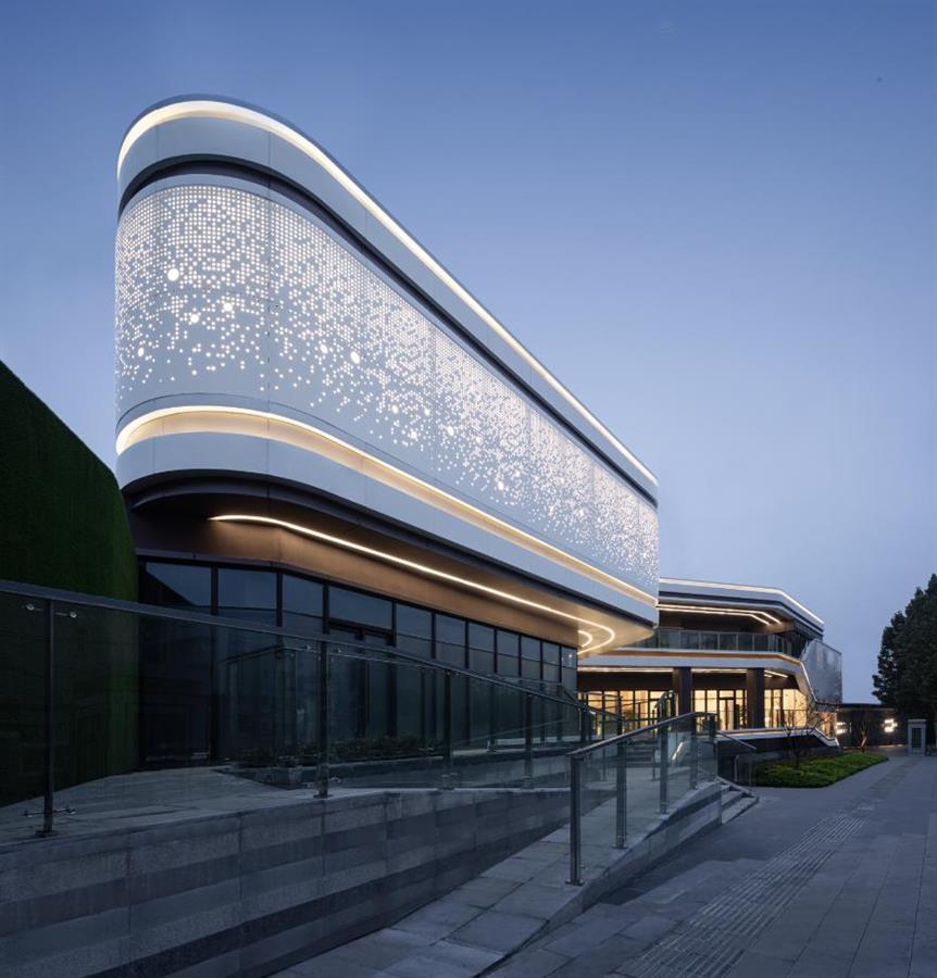 社區(qū)服務(wù)綜合體的立面,多條曲線線條滑動(dòng),延展建筑體量。采用參數(shù)化設(shè)計(jì)模擬幻彩穿孔鋁板肌理,為外部帶來形象提升,為內(nèi)部空間帶來光影變化。到夜晚,動(dòng)態(tài)燈光營(yíng)造浩瀚星空的氛圍。