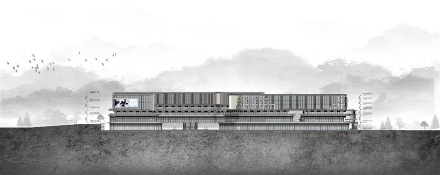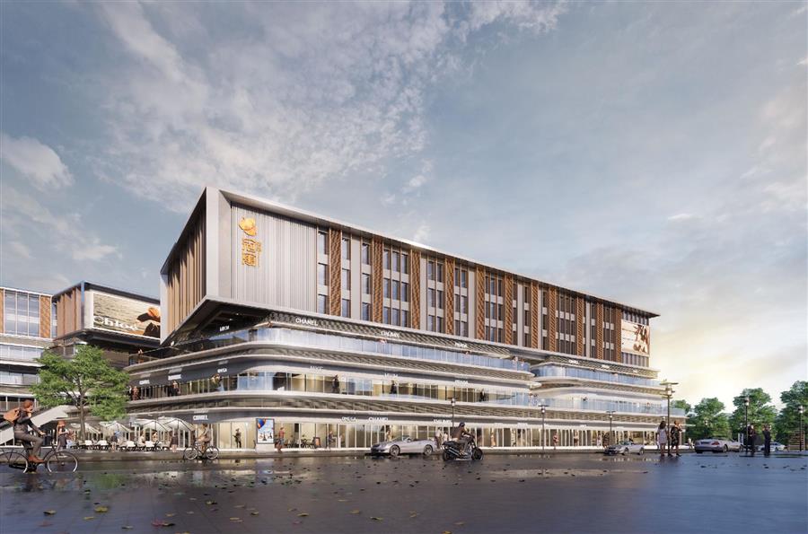 在色彩與材料的選擇上,采用分段式立面設(shè)計(jì),在不同高差對(duì)城市界面做出不同的回應(yīng),底層采用曲線造型,包裹感和時(shí)尚感并存引流人群;上部分采用現(xiàn)代化直角立面,有利于空間的靈活使用,內(nèi)置隱框玻璃幕墻,外設(shè)翻轉(zhuǎn)豎向構(gòu)件,營(yíng)造序列感,適當(dāng)增加傳統(tǒng)元素,呼應(yīng)傳統(tǒng)文脈,同時(shí)配備廣告位、LED等跳躍元素,色彩變幻的燈光效果,使商業(yè)綜合體成為區(qū)域聚集的中心。