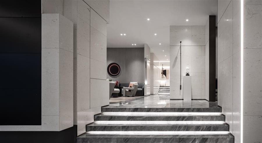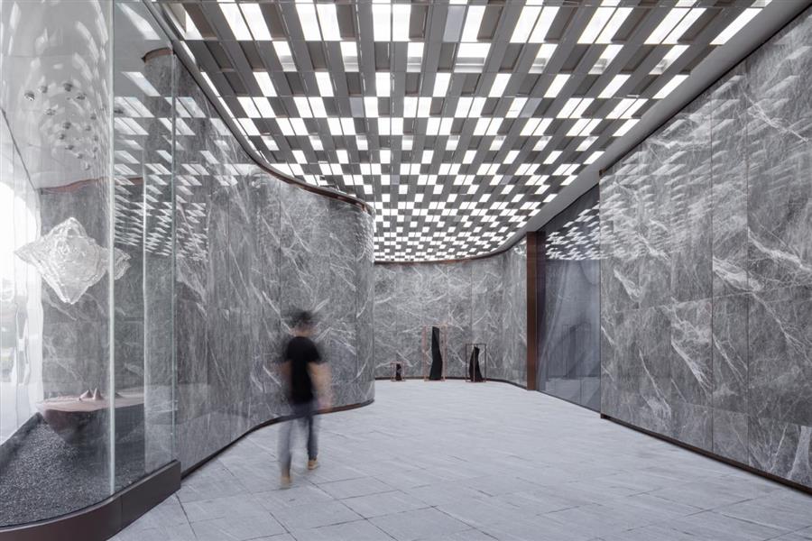 從北側(cè)道路進(jìn)入場(chǎng)地,沿著建筑曲線線條進(jìn)入首層入口空間,向內(nèi)無明確建筑邊界延長(zhǎng)縱深視覺,兩側(cè)使用大理石和玻璃,屋面線性排列鏤空玻璃磚和鋼結(jié)構(gòu)磚框,三個(gè)不同界面的圍合使建筑空間更加開放和神秘。同時(shí),建筑曲線形態(tài)伸展至室內(nèi)空間,不規(guī)則的墻體和旋轉(zhuǎn)樓梯,與建筑的城市界面呼應(yīng),也為之后的商業(yè)空間出售帶來更多可能性。