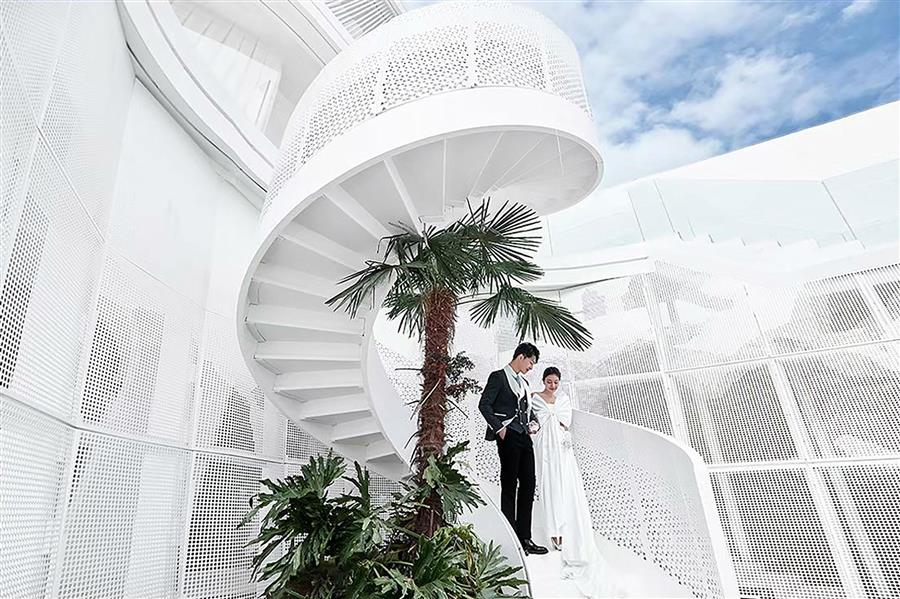 在場(chǎng)地附近的環(huán)海公路上,無(wú)論天氣陰晴,都有追求山盟海誓的男男女女在拍婚紗,顯然在車(chē)來(lái)車(chē)往的公路邊拍照并不理想。于設(shè)計(jì)師而言,與業(yè)主一起創(chuàng)造一個(gè)舒適并激動(dòng)人心的美學(xué)空間來(lái)滿(mǎn)足旅拍人群的需求是很有意義的事情。