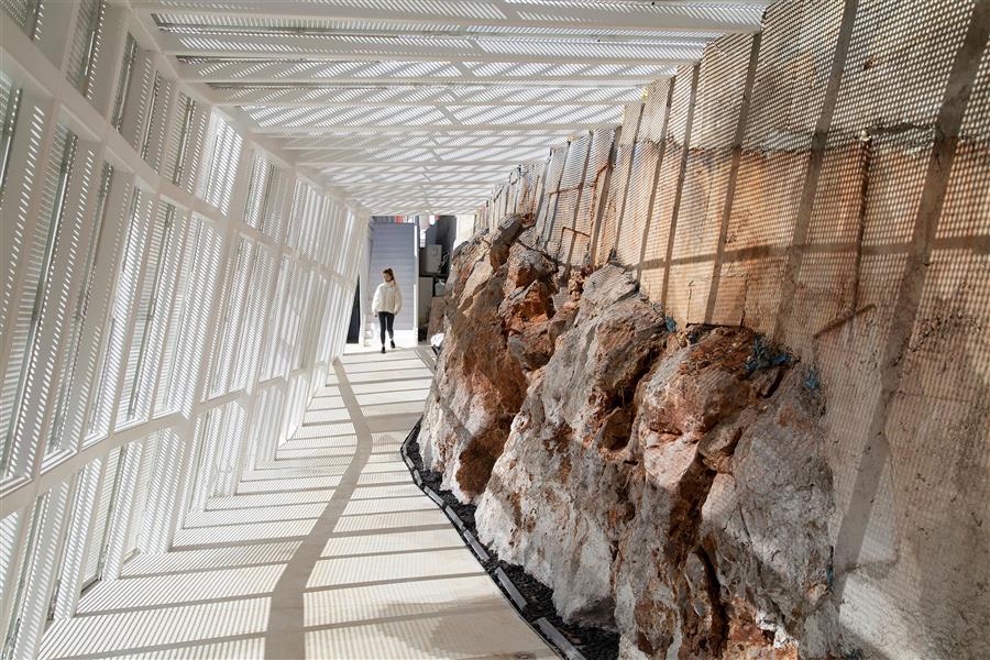 建筑活動(dòng)使擋土墻裸露出天然的卡斯特紅巖,這是場(chǎng)地中不可忽視的資源。在室內(nèi)外的設(shè)計(jì)中我們有意的保留原始巖面的自然之美,這種人工與自然之間的結(jié)合讓空間也因此有了一種呼吸感。
