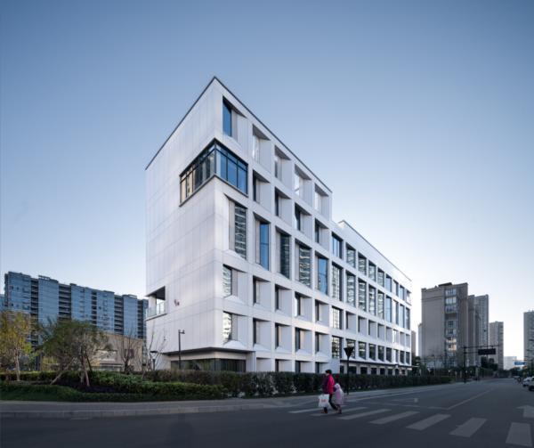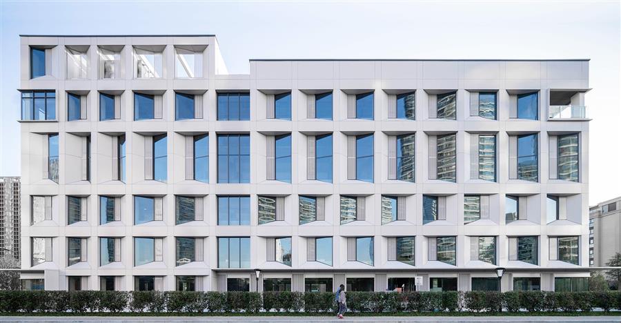 “小白樓”的立面設計尊重原有結構的柱網模數,通過錯動的開窗設計,為建筑增加了幾分靈動,也在視覺上削弱了因原有建筑尺度造成的厚重感。開啟扇的隱藏設計使立面的線條簡約勻稱,呈現(xiàn)的視覺效果更為整潔,在滿足辦公空間采光通風需求的同時,也提升了建筑的整體質感。