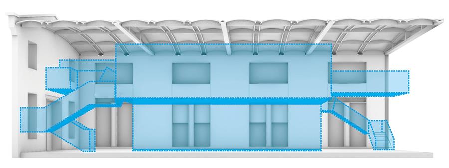設計將老廠房的拱形屋頂安裝回原有的位置,室內屋頂的加固材料采用透明玻璃材質,使拱形屋頂在室內如“歷史遺跡標本”般存在。