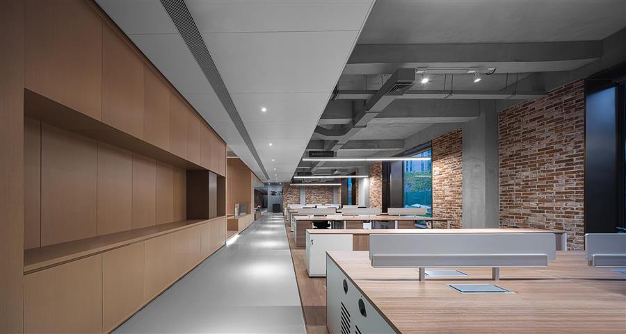 開敞辦公區(qū)作為box之一,其混凝土結構完全裸露,和保留的老紅磚形成獨特的界面韻律。與之相鄰的另一個空間則采用木飾面、仿銅不銹鋼等現(xiàn)代材料組合而成。通過新舊材料的強烈對比來自然劃分辦公和休閑空間,營造同一空間內的跨時空體驗。