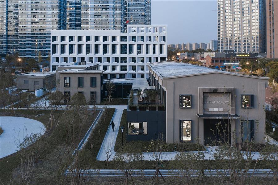 杭州化纖廠舊址改造項目位于杭州市拱墅區(qū)藍孔雀板塊,包含杭實工發(fā)銘座辦公園區(qū)和城市公園兩部分,其規(guī)劃、建筑、景觀、室內及軟裝設計由零壹城市一體化完成。
