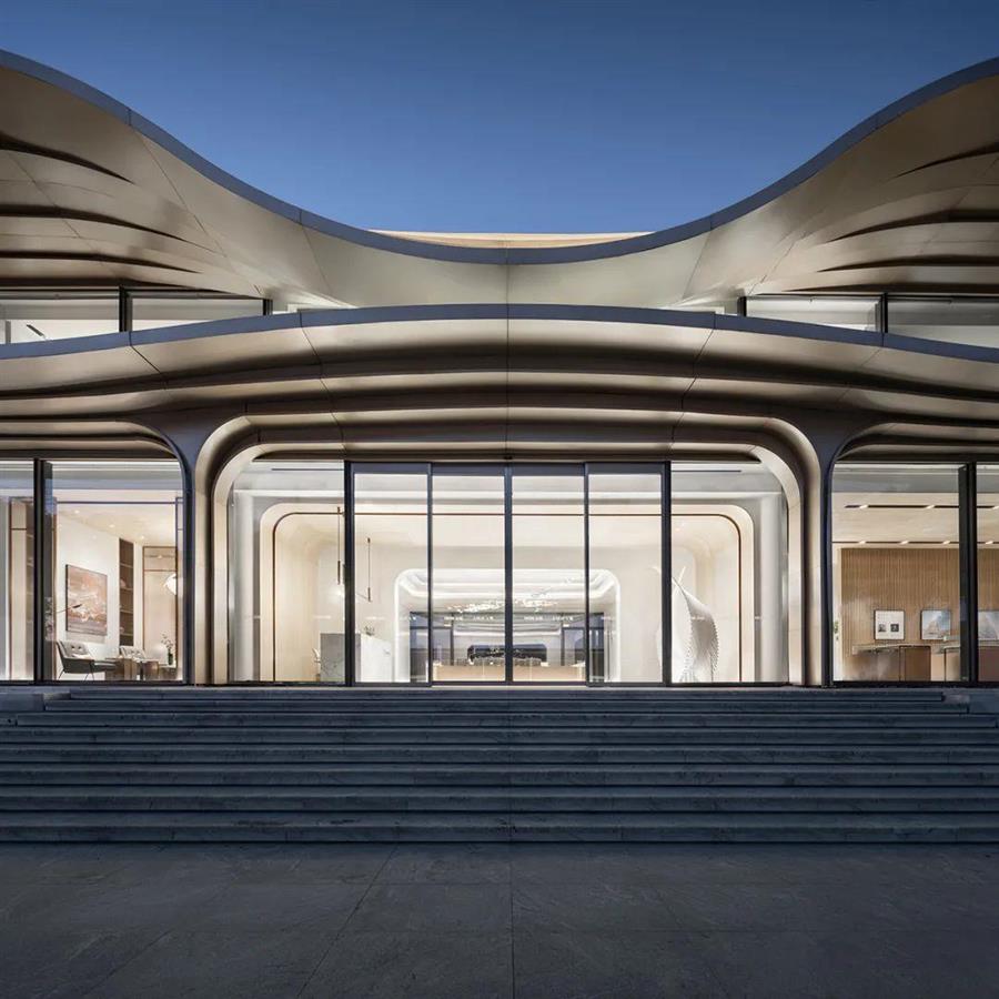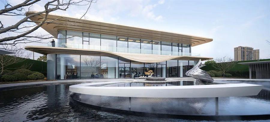 建筑立面采用大面積落地玻璃,面向街道,開門迎客,滿足生活美學(xué)館的展示功能;對(duì)內(nèi)則環(huán)抱水景,別有洞天。