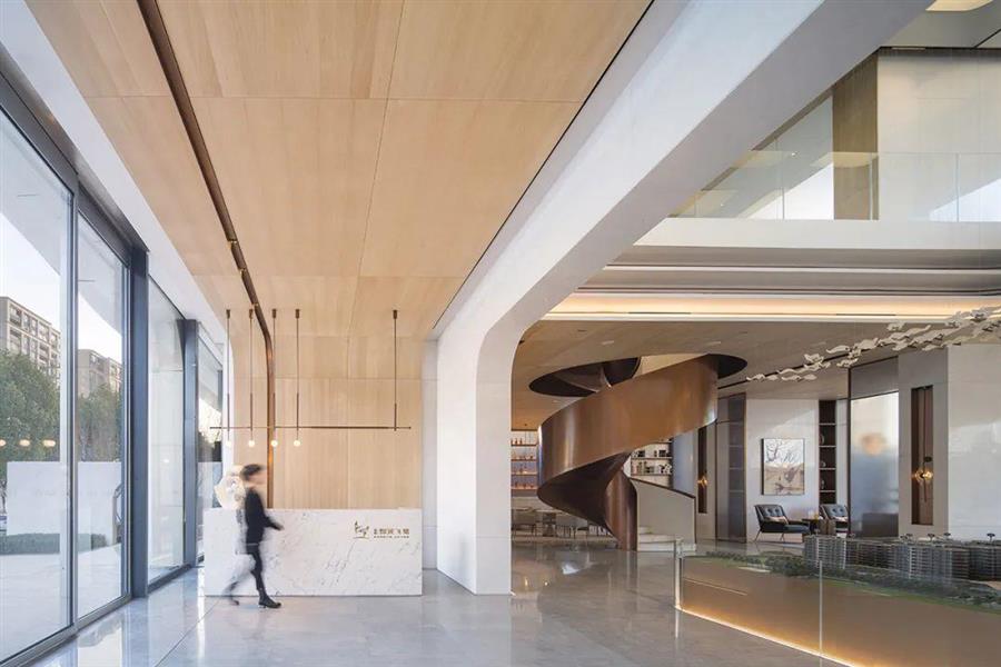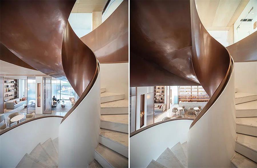沙盤區(qū)側(cè)面的古銅色旋轉(zhuǎn)樓梯,是重要的視覺元素,指引動(dòng)線從主廳走向洽談區(qū),扭動(dòng)與斷續(xù)中,豐富了空間層次。
