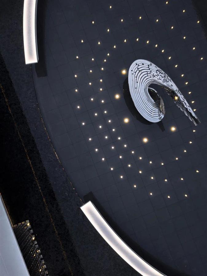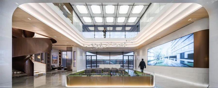 穿過門廳,來到兩層通高的中心展廳,高度的錯(cuò)落轉(zhuǎn)換,收放之間,豁然開朗。以沙盤為核心,圓角矩形蕩漾出通高中庭,內(nèi)收為層疊燈帶,繼續(xù)上浮分形,排列成薄膜頂燈,空間縱向延伸,幾何交互統(tǒng)一。