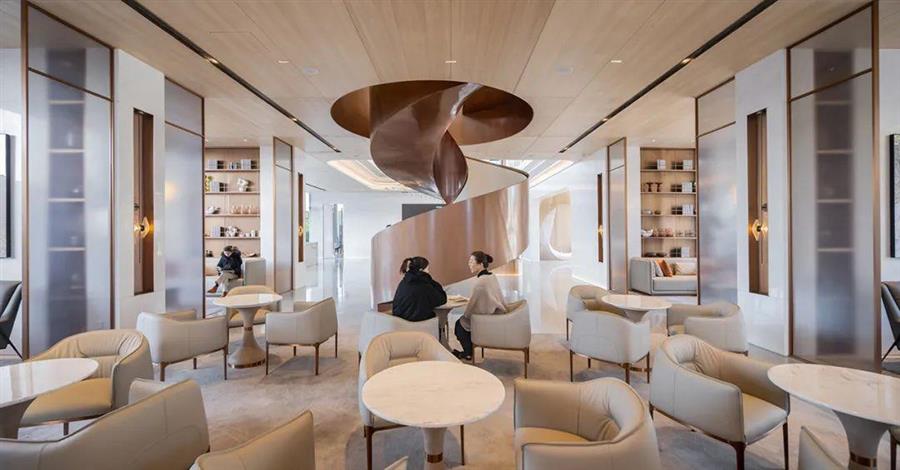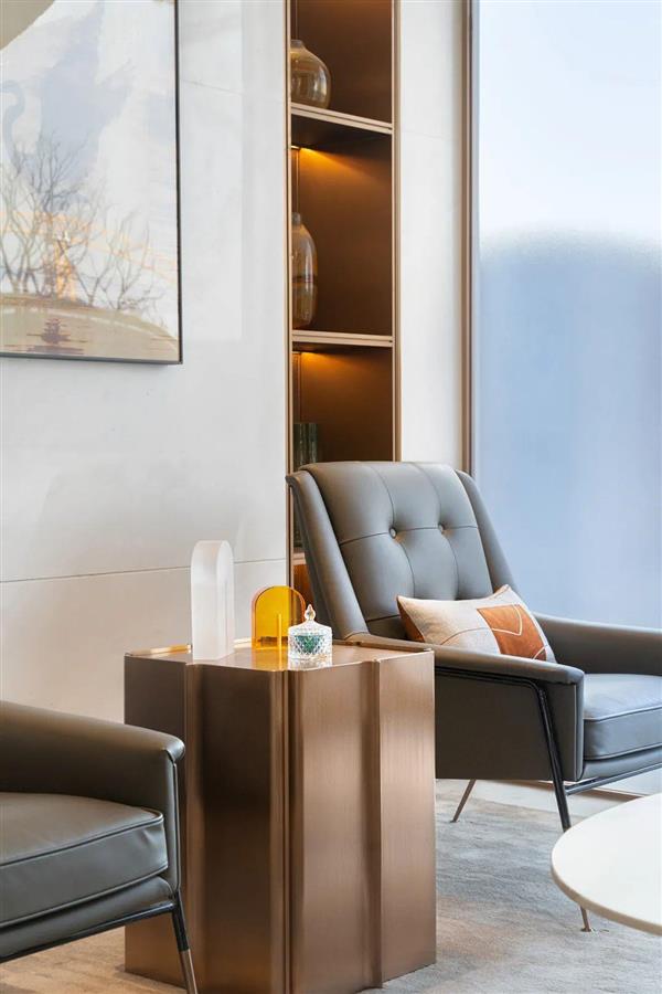 洽談區(qū)選用 Tocsconova的白色真皮座椅,點(diǎn)綴“鷺腳”椅腿和"樹枝"燈具等線性要素,營(yíng)造出舒適溫暖又精致的空間氛圍。兩側(cè)卡座作為深度洽談區(qū),用夾絲玻璃移門隔出,兼顧了私密性和通透感。