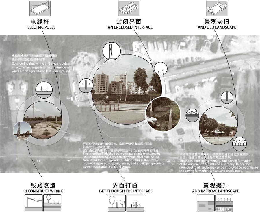現(xiàn)狀:界面處受市政行道樹遮擋,南面開口受市政圍欄限制,轉(zhuǎn)角處有三棟居民樓,場地內(nèi)有高壓電線桿,圍墻及市政綠化、鋪裝雜亂老舊。
