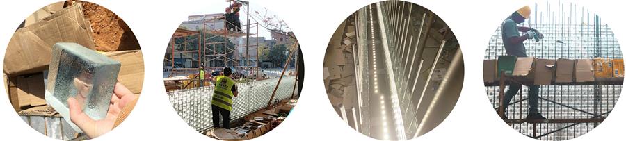 △ 精磨玻璃磚采用200x100x50標(biāo)準(zhǔn)化規(guī)格,以縱向不銹鋼條穿孔固定,不銹鋼封邊處理。為了整體比例和光影效果最佳,現(xiàn)場采用了多種規(guī)格和不同透明度的磚體組合打樣。墻內(nèi)安裝射燈,在夜景中發(fā)揮玻璃磚材質(zhì)的光影魅力。