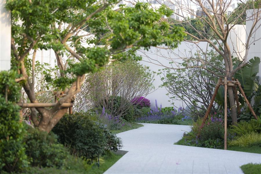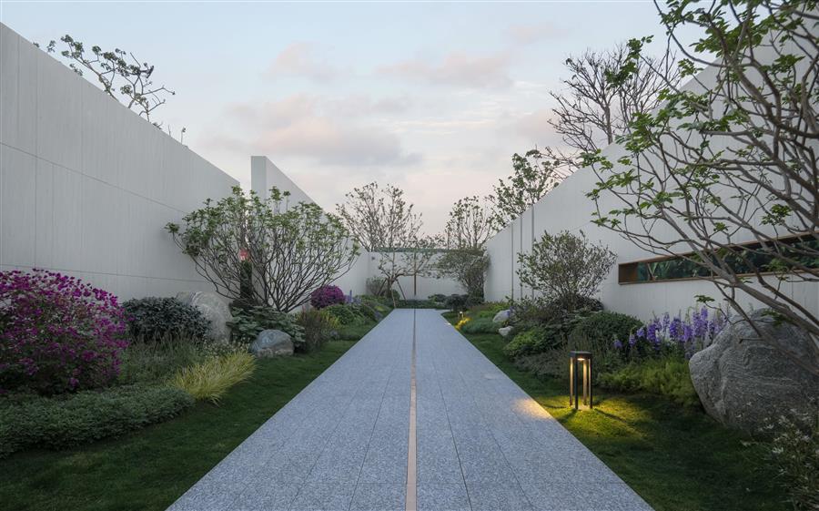 帶著尋夢的心情向花徑深處走去,道路曲折迂回,景墻以精心設(shè)計的角度伸展,分割空間、屏蔽喧囂、留住清凈。