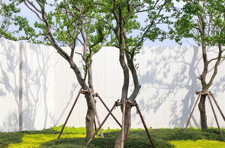 當(dāng)風(fēng)吹起,枝葉簌簌,當(dāng)自然想要揮筆潑墨,作為空間的營造者,我們在烏桕林輕輕放下幾折素雅溫潤白墻,留下婆娑樹影,與林共舞。