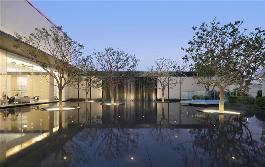 站在內(nèi)庭,身旁空無一物,又被萬物環(huán)抱,與天地同游。側(cè)耳聽,水流淙淙,流水板藏于一隅;有風(fēng)起,水波蕩漾,風(fēng)動幕墻波光粼粼。