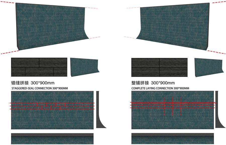 △ 流水板鋪裝方式考慮到整鋪拼接過程中,石材批次、現(xiàn)場施工難以控制,拼接過程中可能出現(xiàn)縫隙較大,銜接瑕疵,故采用錯縫拼接,最大完美展現(xiàn)流水板的整體效果。