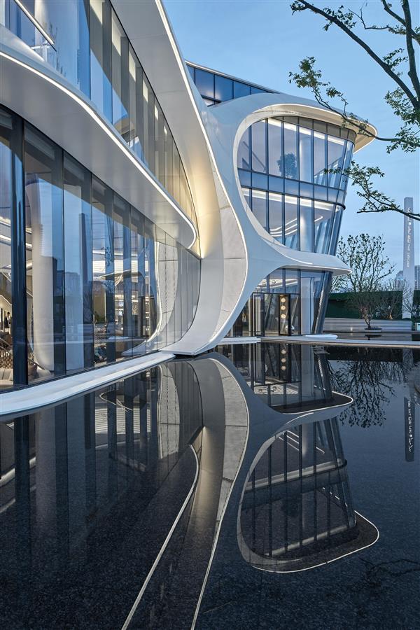 立面的弧形鋁板,月牙形穿孔板及建筑尾部的3級(jí)退臺(tái)造型,結(jié)合鏡面水景,環(huán)境和陽光被溫柔的反射進(jìn)來,創(chuàng)造出一種連續(xù)、透明的感覺。