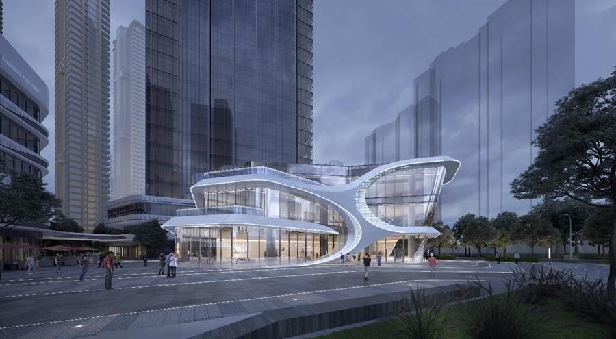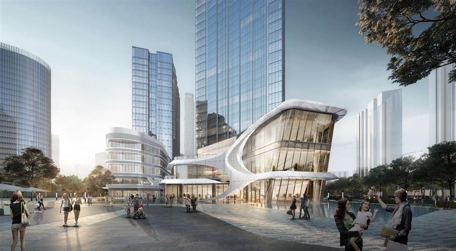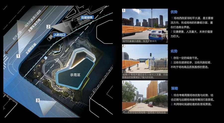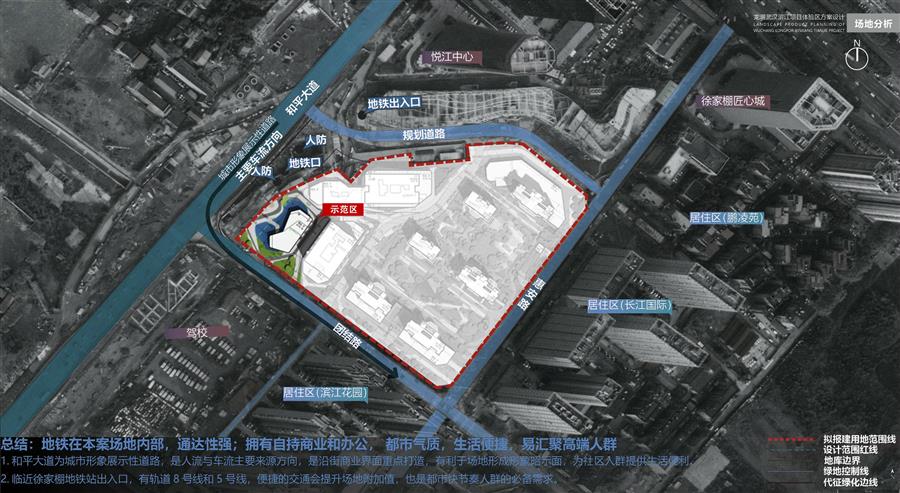 示范區(qū)選址于用地西側(cè),面向和平大道及長(zhǎng)江二橋,有利于聚攏人群視線,呈現(xiàn)建筑的最佳城市展示面。同時(shí),示范區(qū)與徐家棚地鐵口接駁,交通便捷,是人流的主要的匯集地。