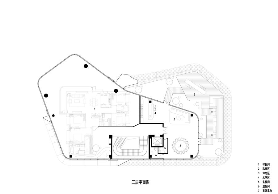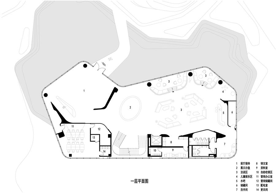 建筑尾部層層退臺(tái),形成游艇露臺(tái)一般的內(nèi)外互動(dòng)。建筑首層為接待區(qū),展示區(qū),洽談區(qū),兒童娛樂區(qū),水吧,辦公區(qū);二層為樣板區(qū)和物業(yè)辦公;三層為樣板區(qū)和私宴。在銷售周期結(jié)束之后,建筑將作為社區(qū)會(huì)所使用,強(qiáng)化公共交互功能,提供室內(nèi)外交融的空間體驗(yàn)。